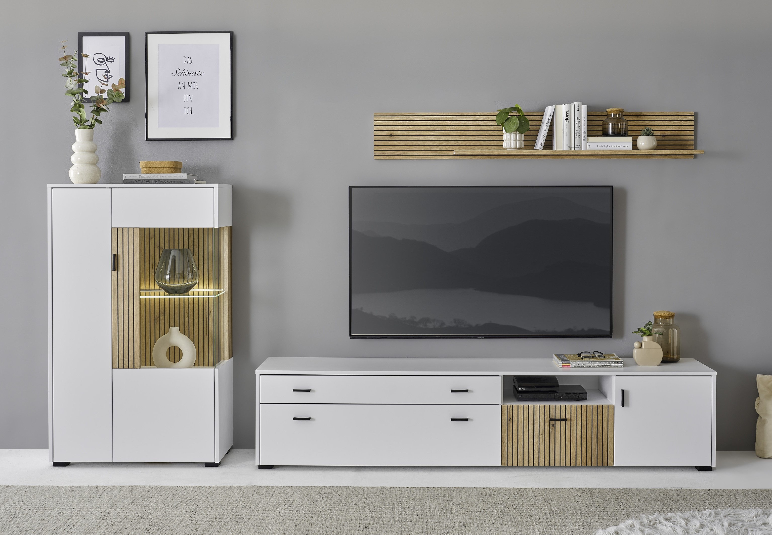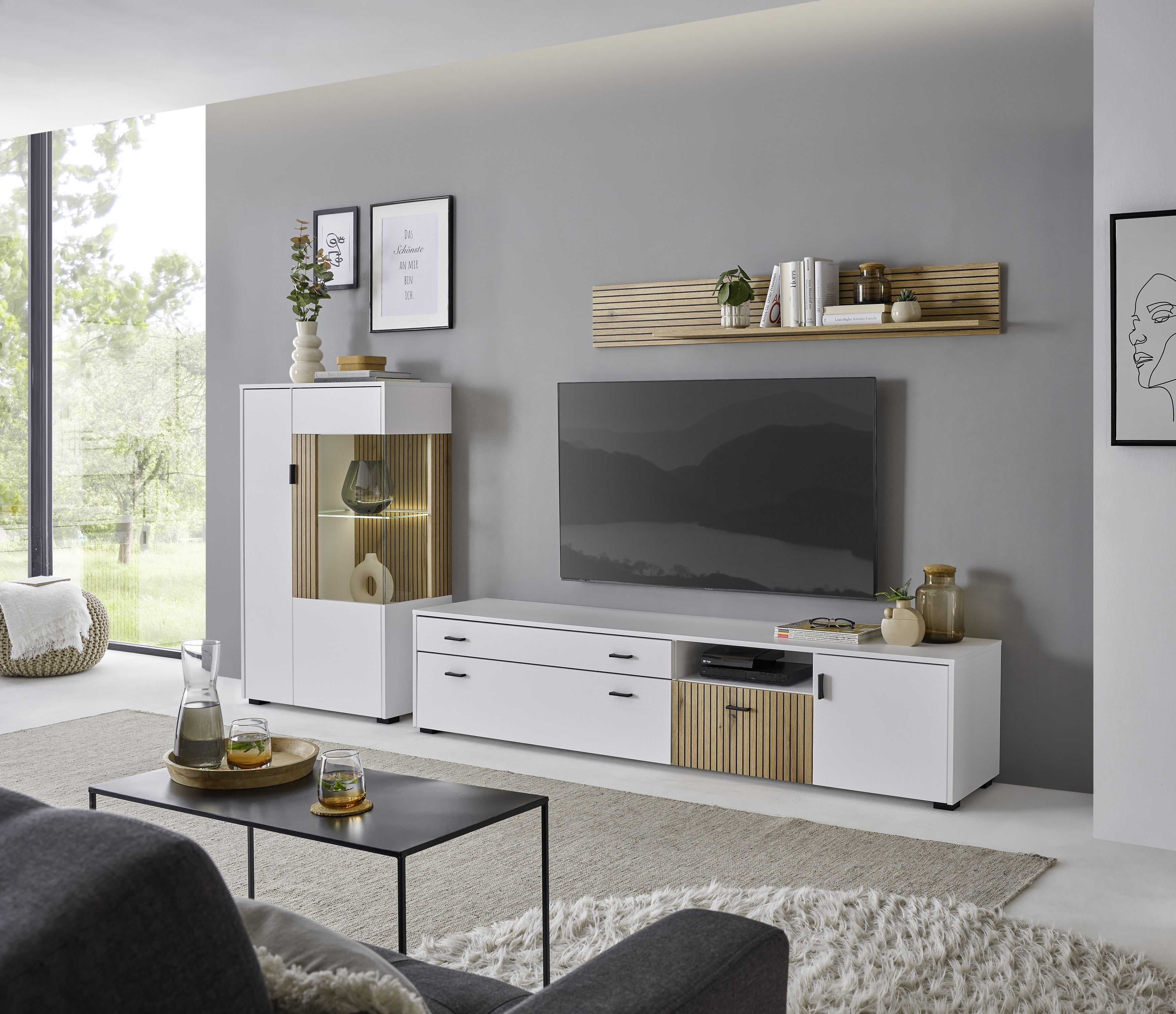 1 Lowboard mit 2 Türen, 1 Klappe, 1 Schubkasten und ein Gerätefach