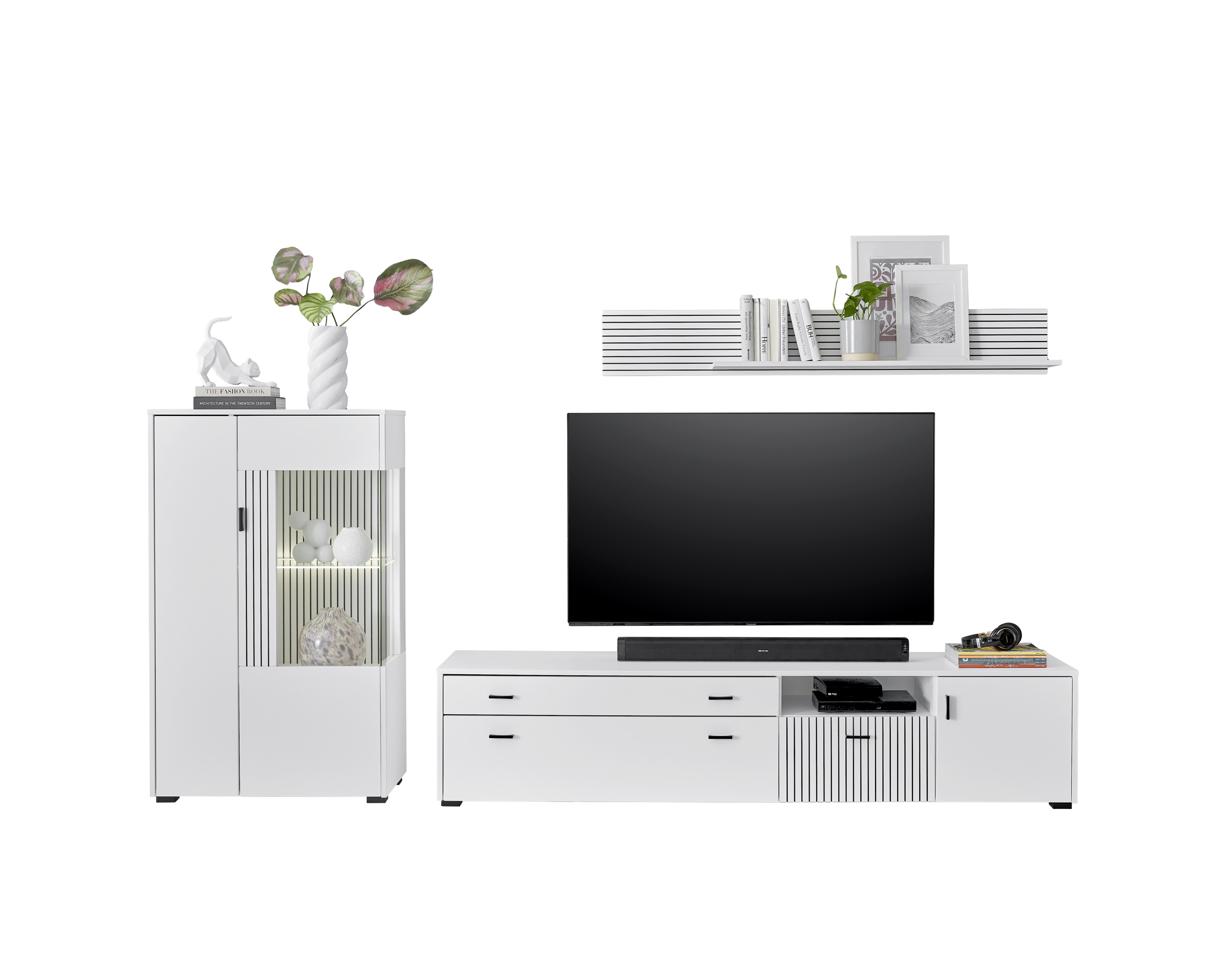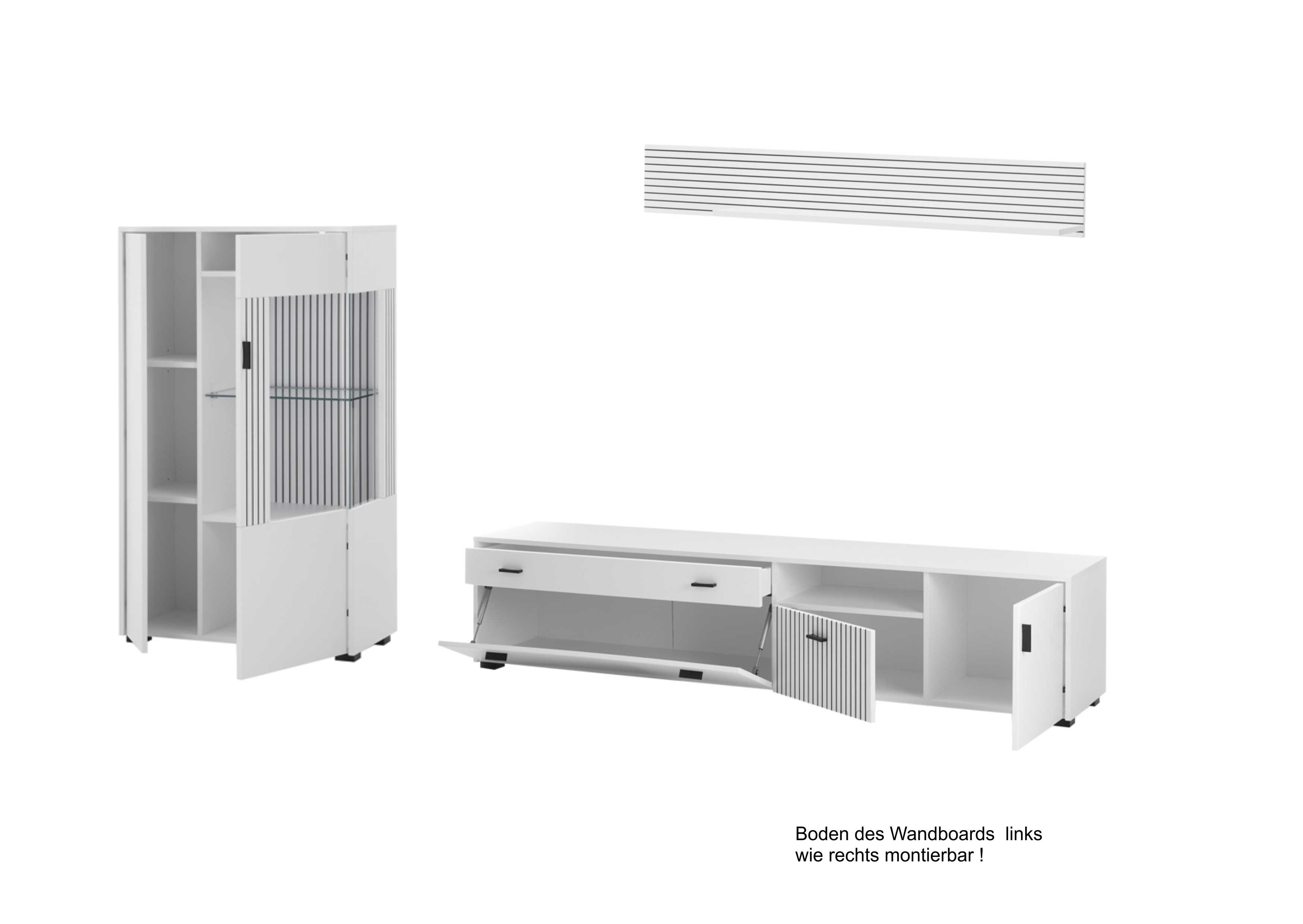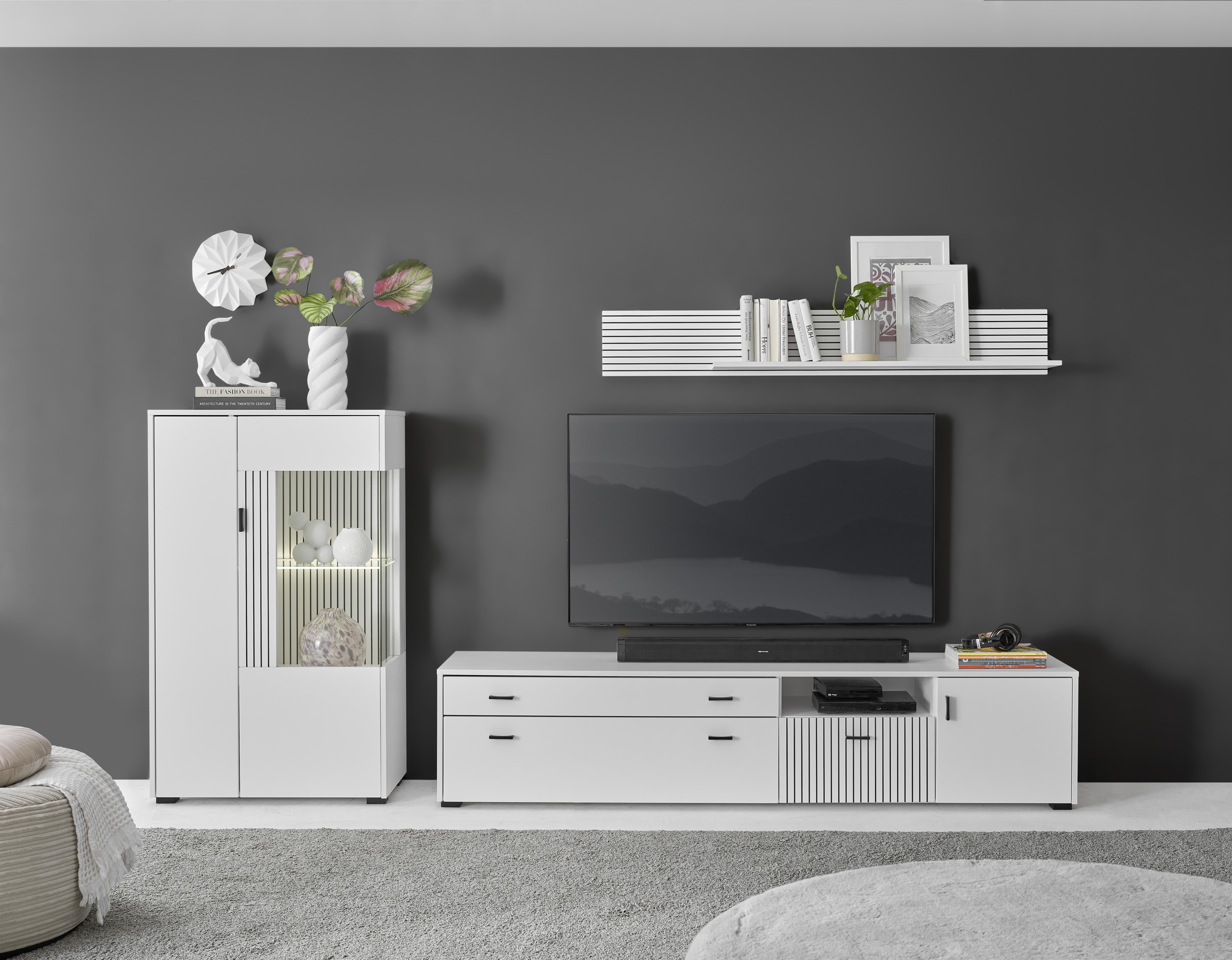 1 Lowboard mit 2 Türen, 1 Klappe, 1 Schubkasten und ein Gerätefach