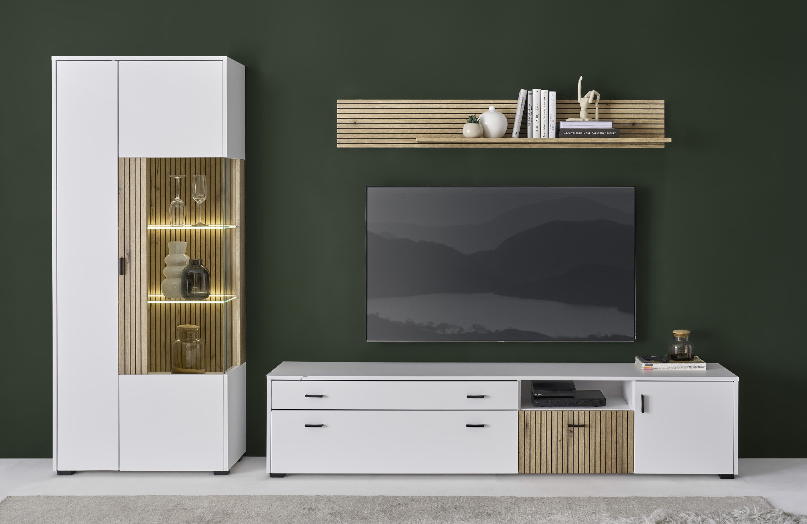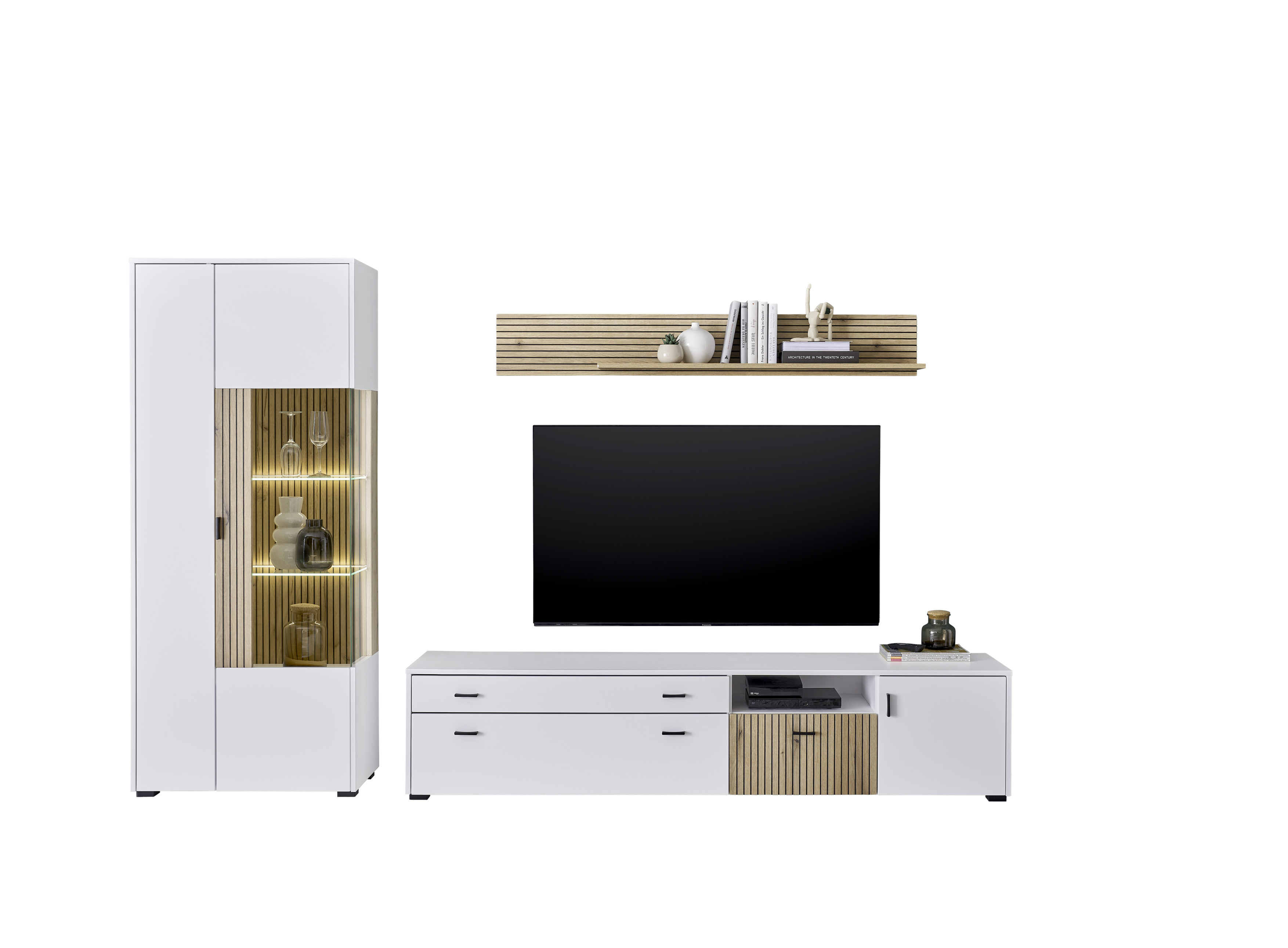 1 Lowboard mit 2 Türen, 1 Klappe, 1 Schubkasten und ein Gerätefach