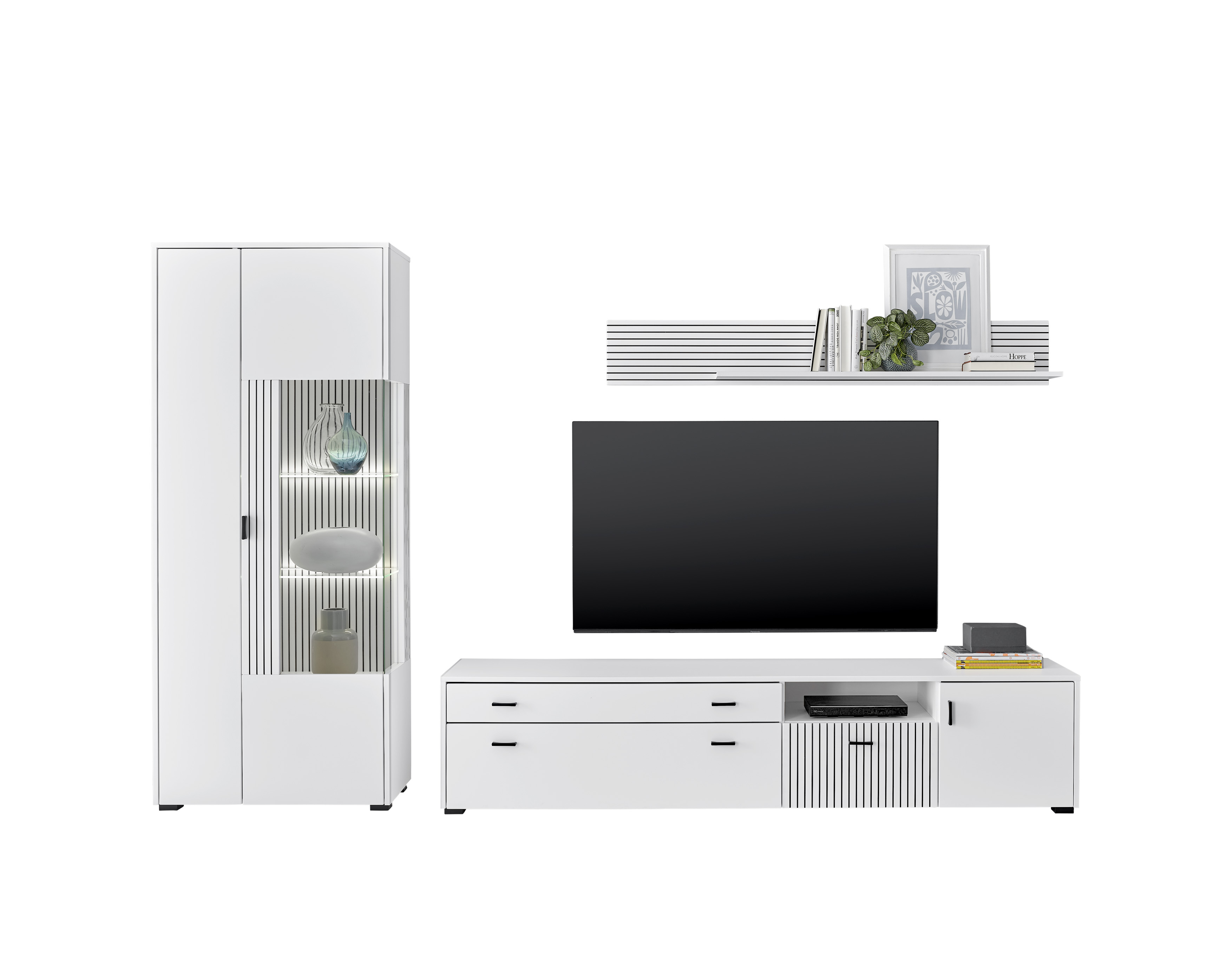 1 Lowboard mit 2 Türen, 1 Klappe, 1 Schubkasten und ein Gerätefach