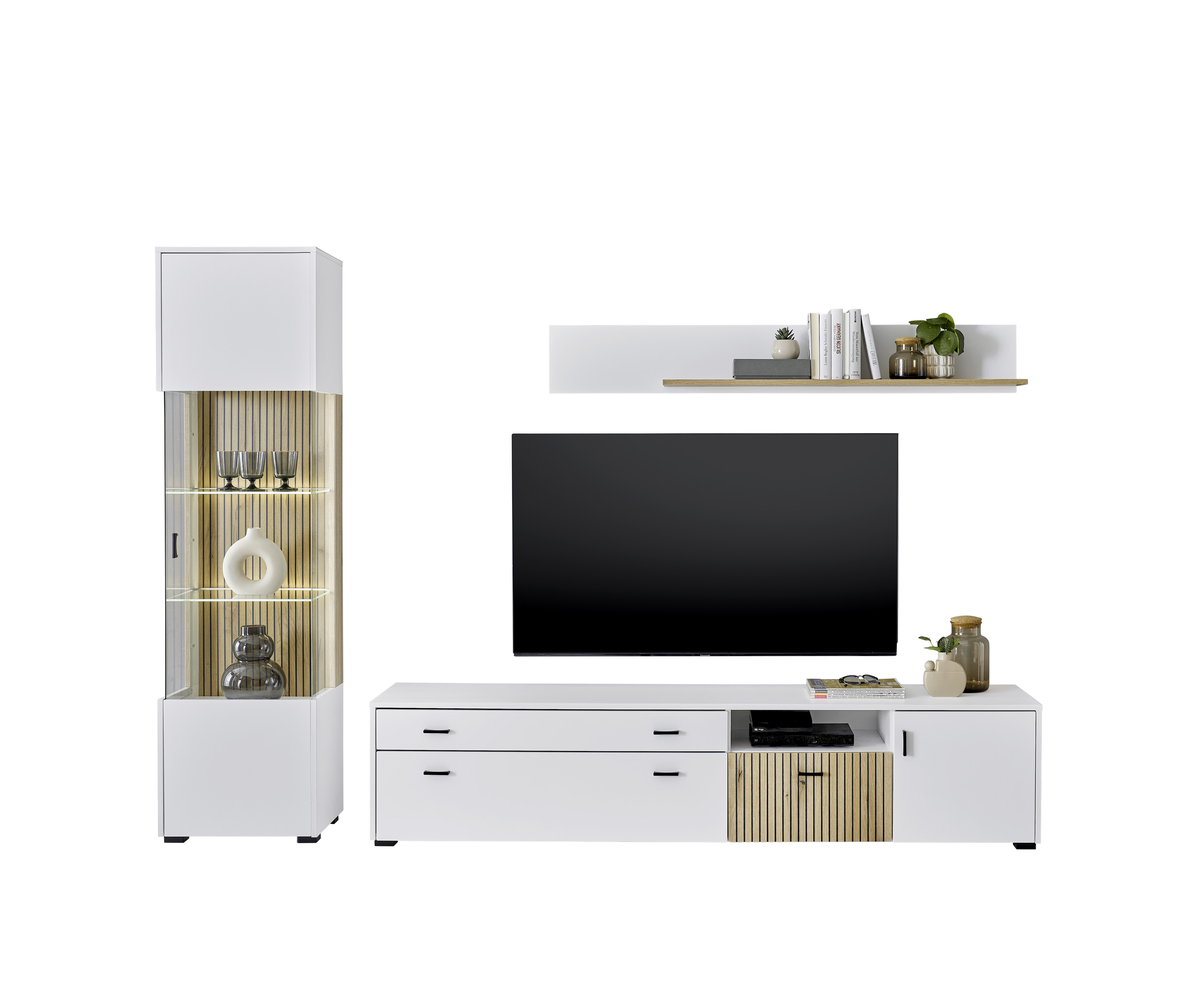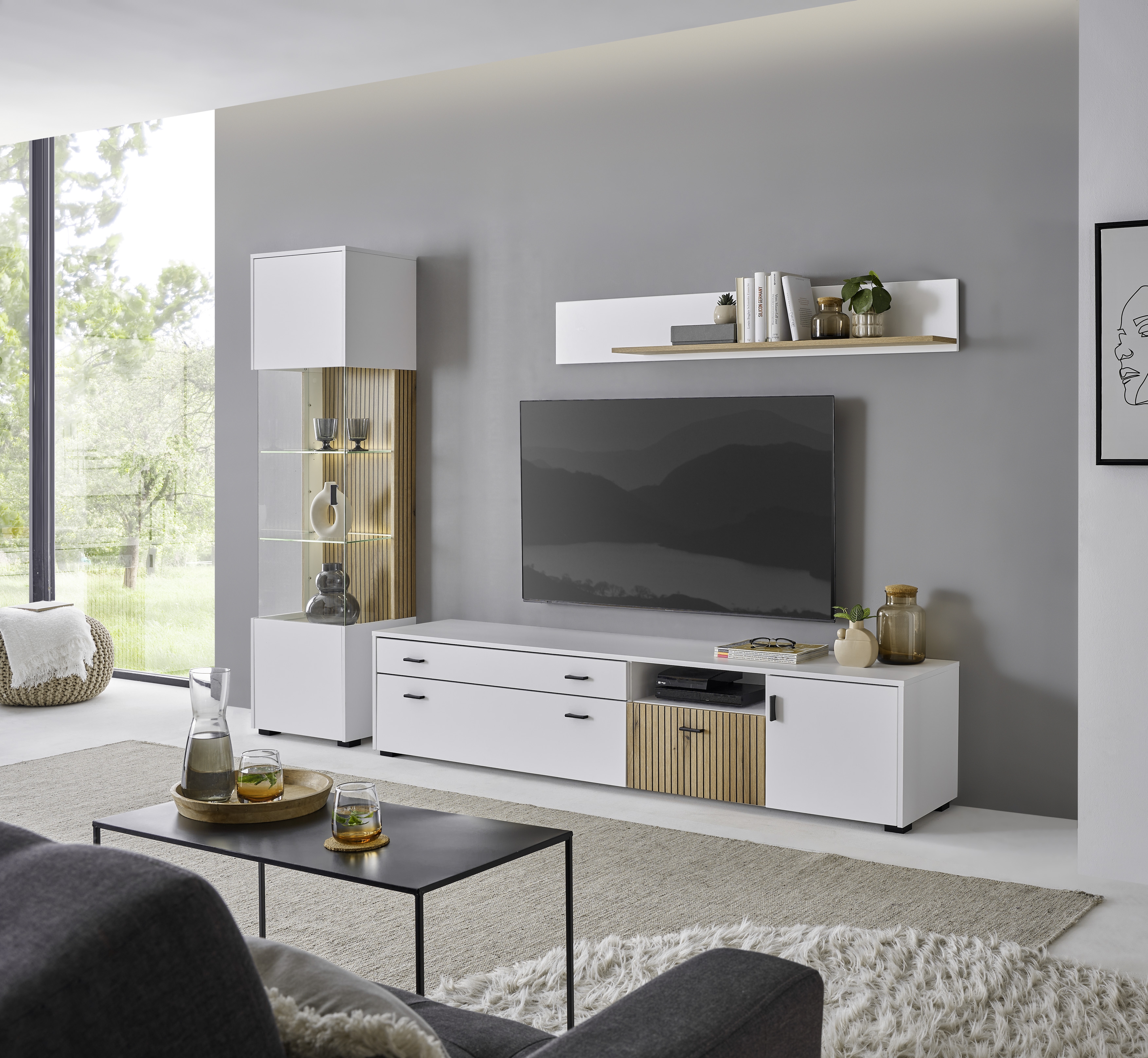 1 Lowboard mit 2 Türen, 1 Klappe, 1 Schubkasten und ein Gerätefach