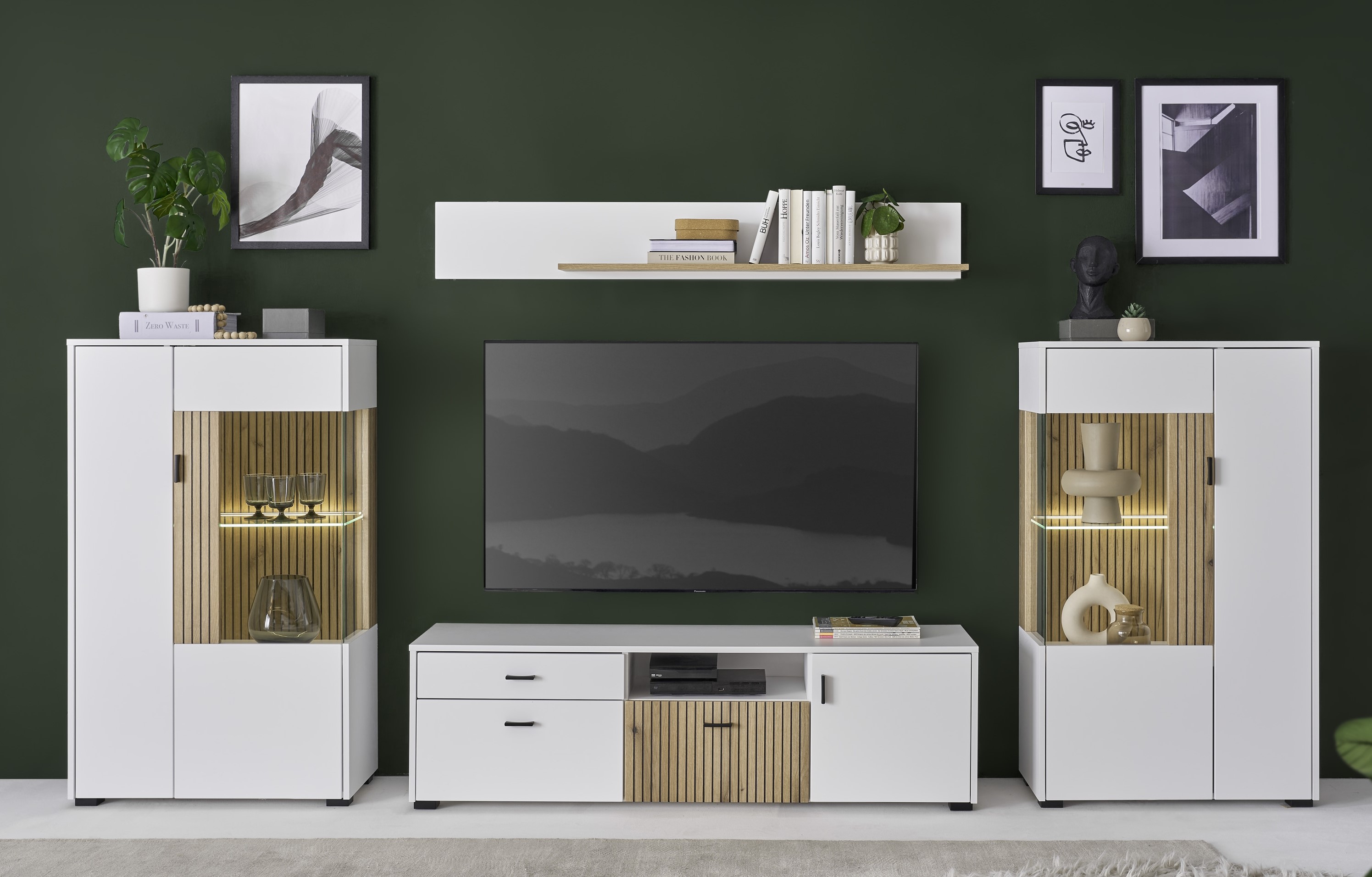 1 Lowboard mit 2 Türen, 1 Klappe, 1 Schubkasten und ein Gerätefach