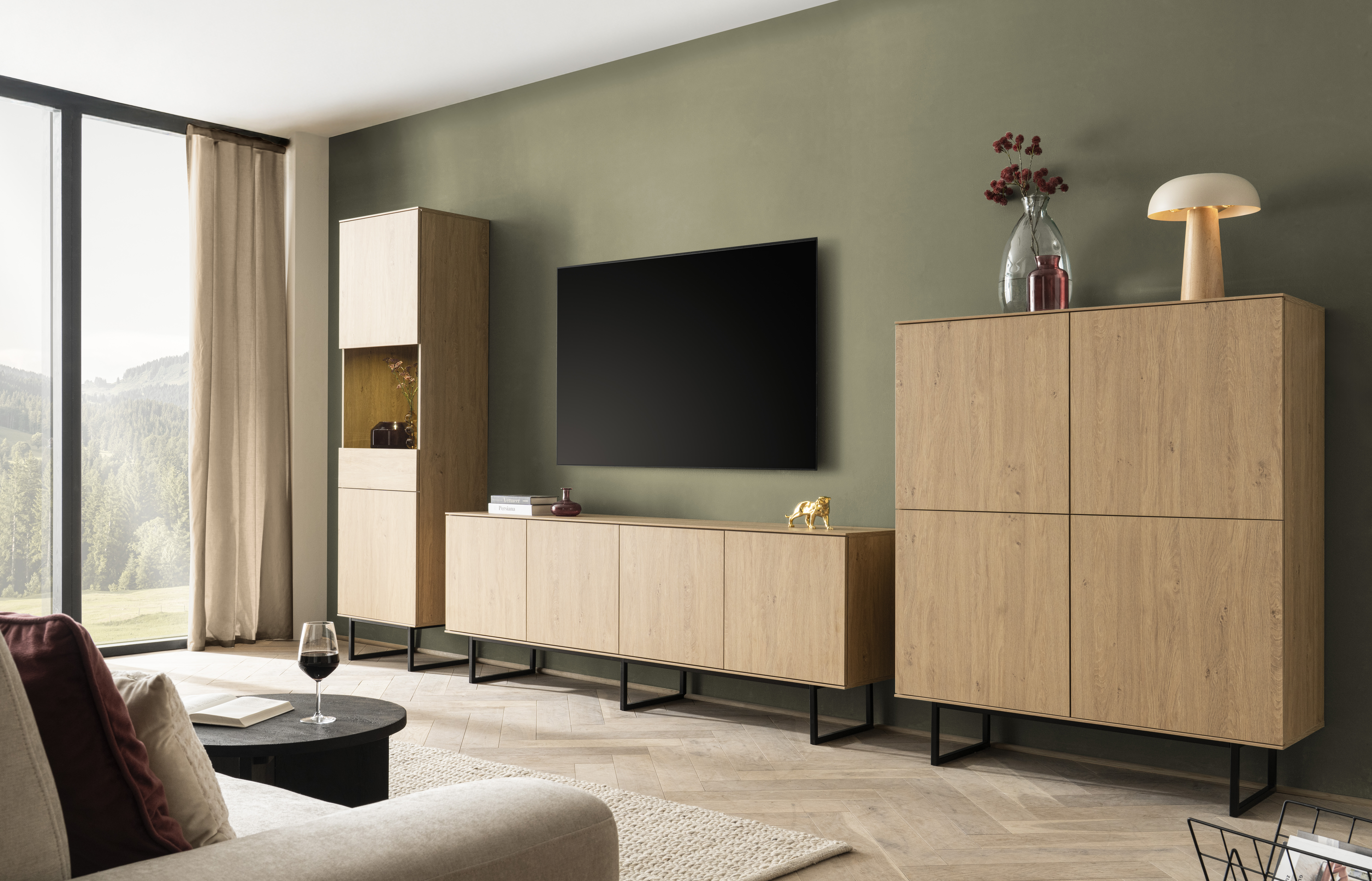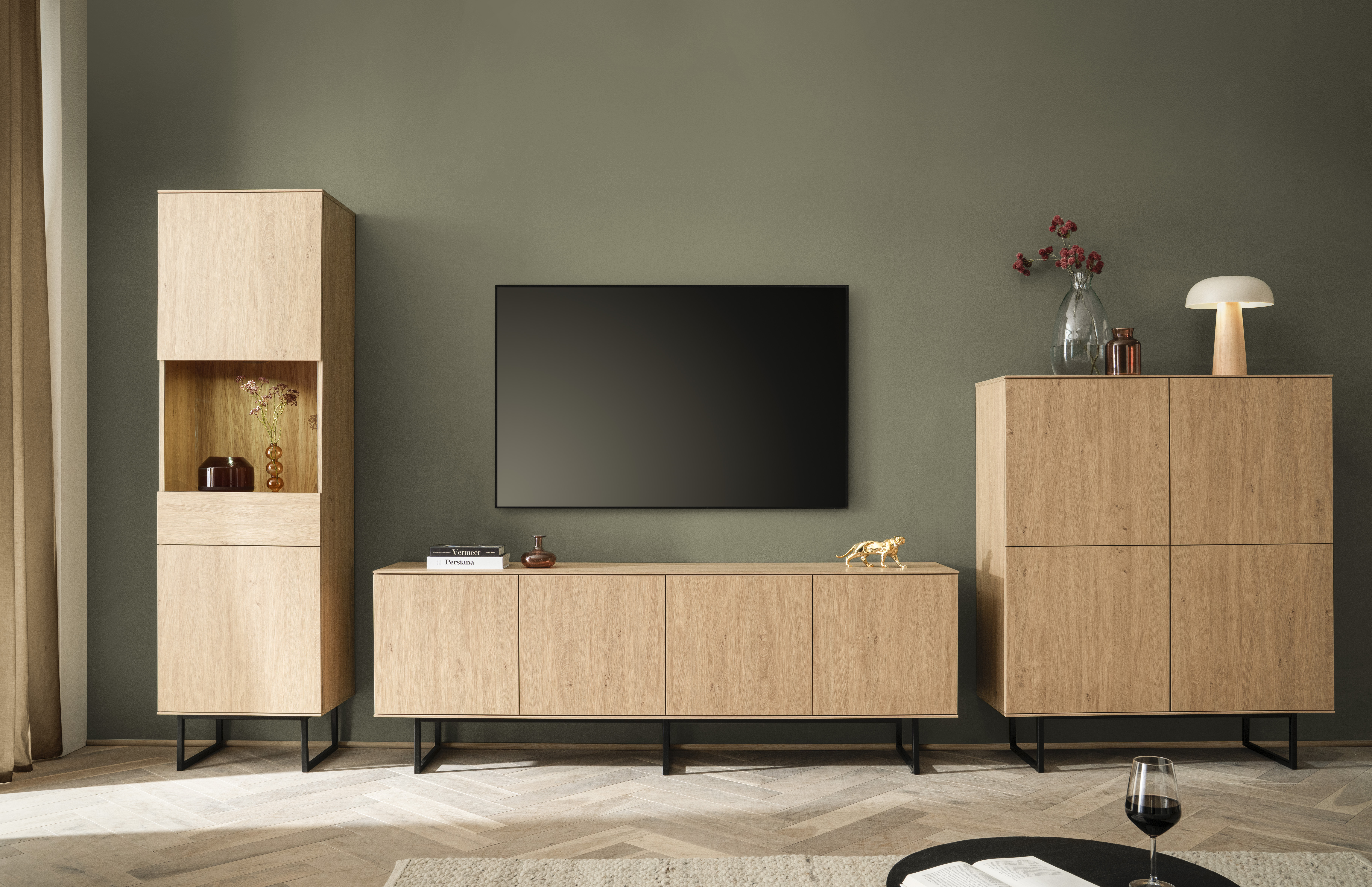 Die dreiteilige Kombination aus Highboard, Lowboard und Vitrine bietet viel Stauraum für Geschirr, Bücher, Mediengeräte und Dekoration.