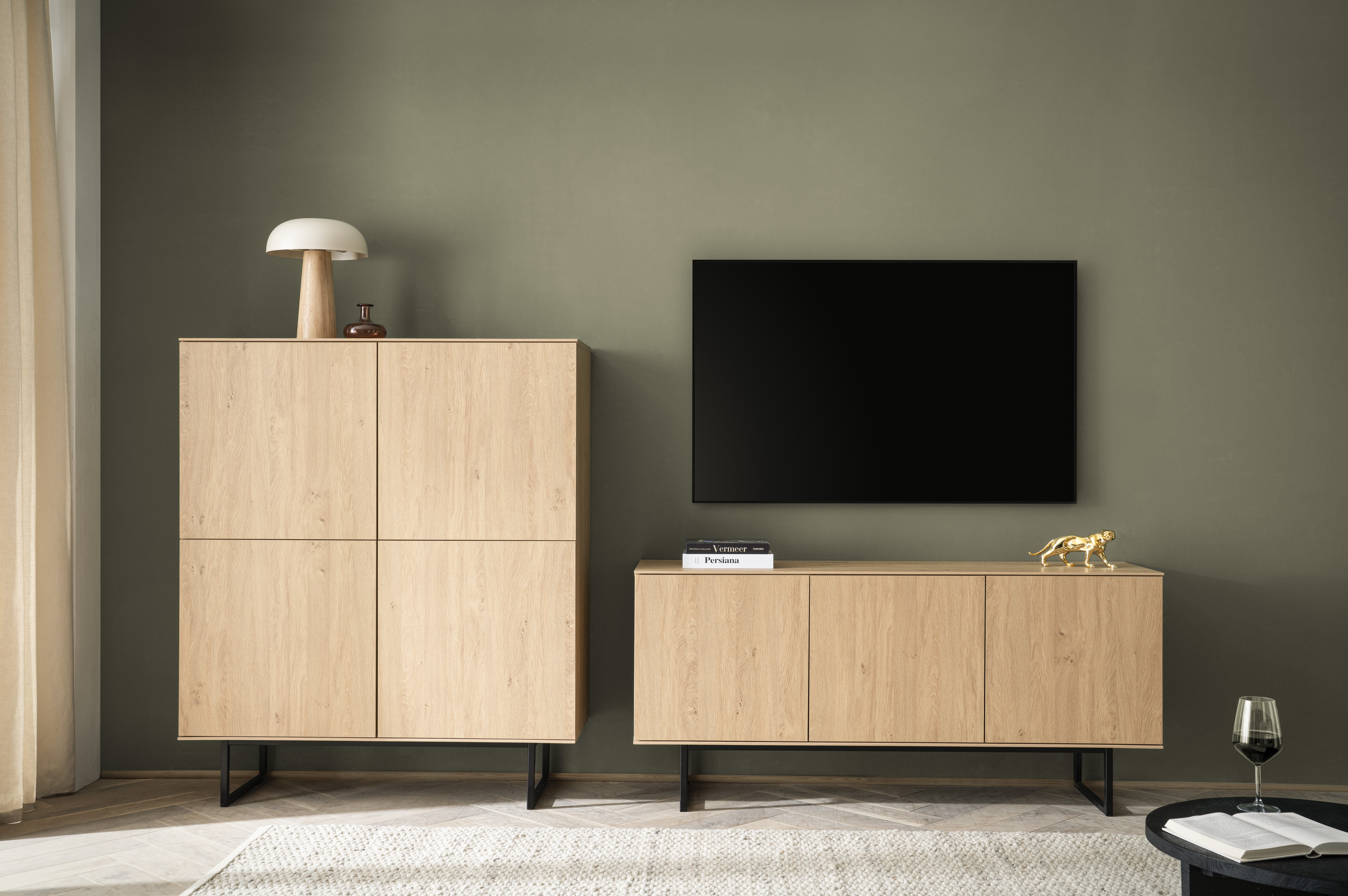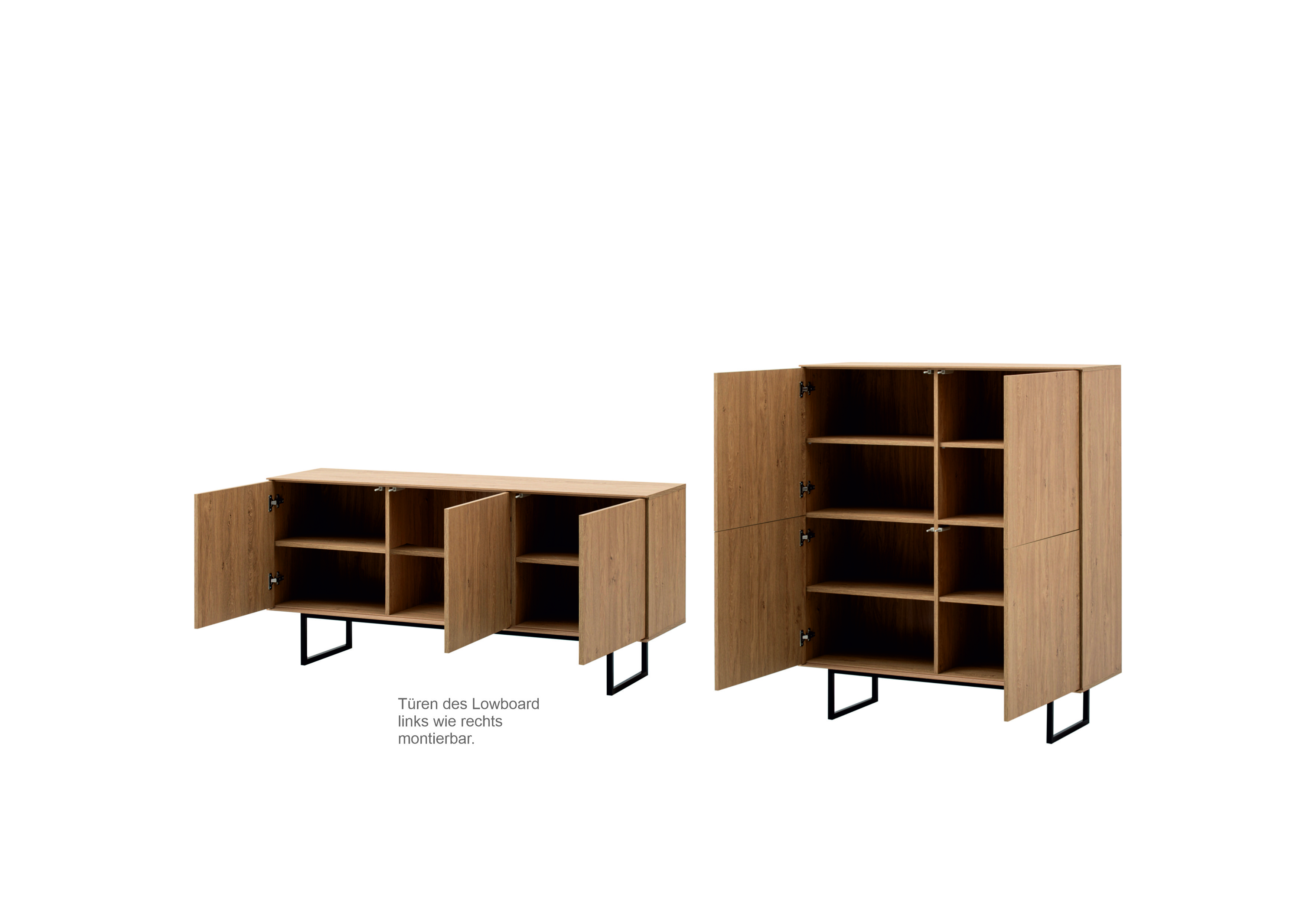 Die zweiteilige Kombination aus Highboard und Lowboard bietet viel Stauraum für Geschirr, Bücher, Mediengeräte und Dekoration.