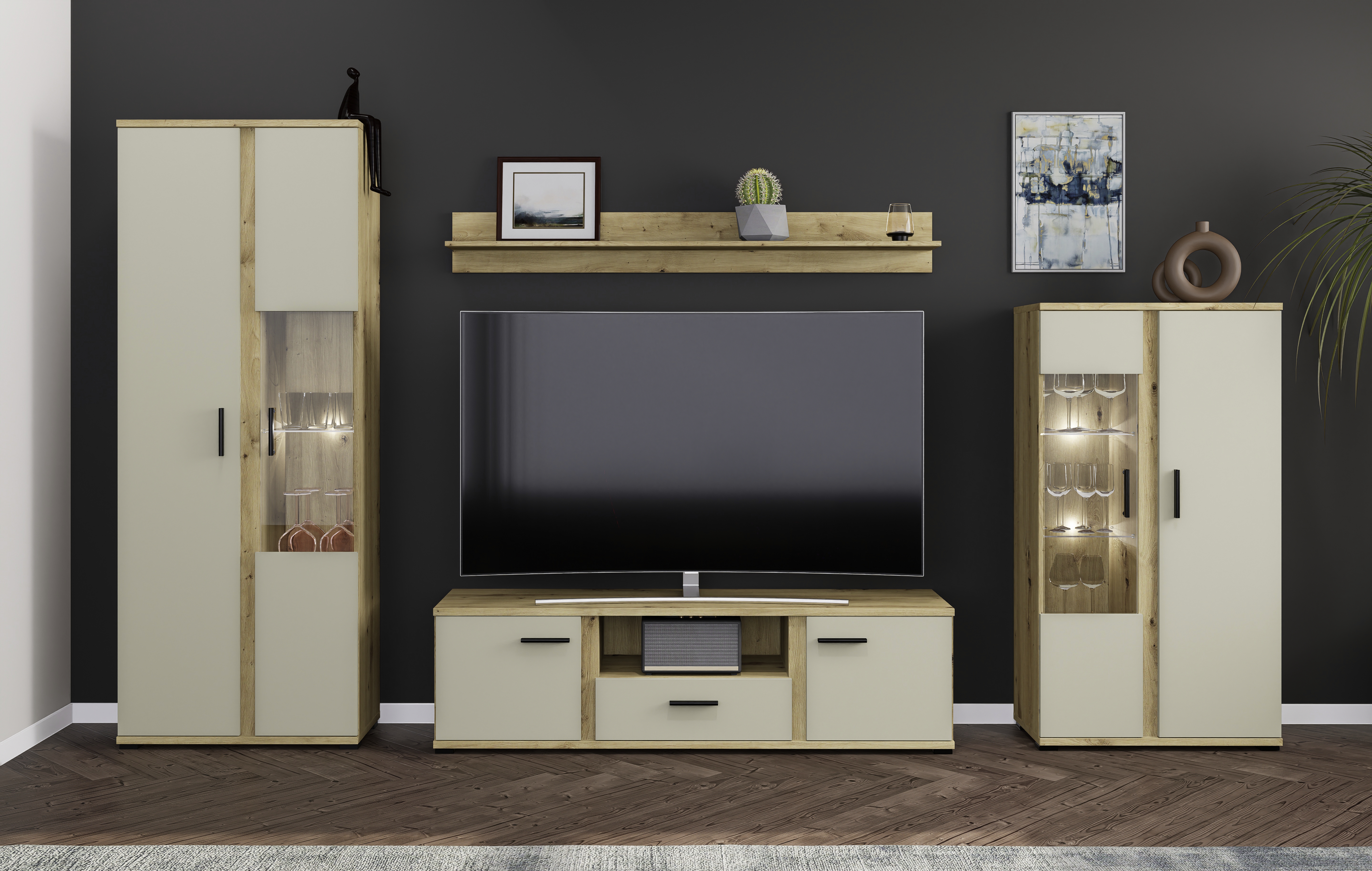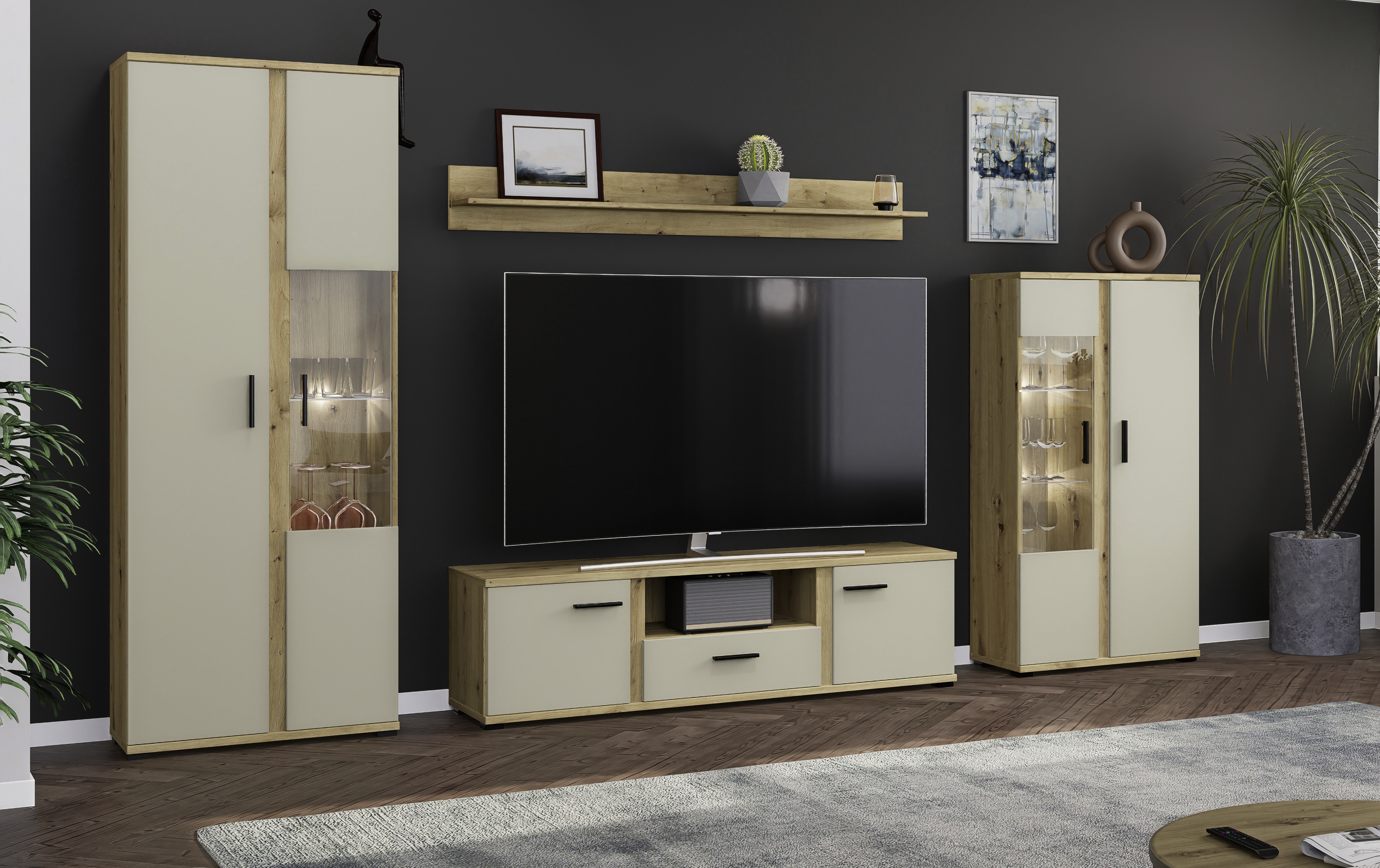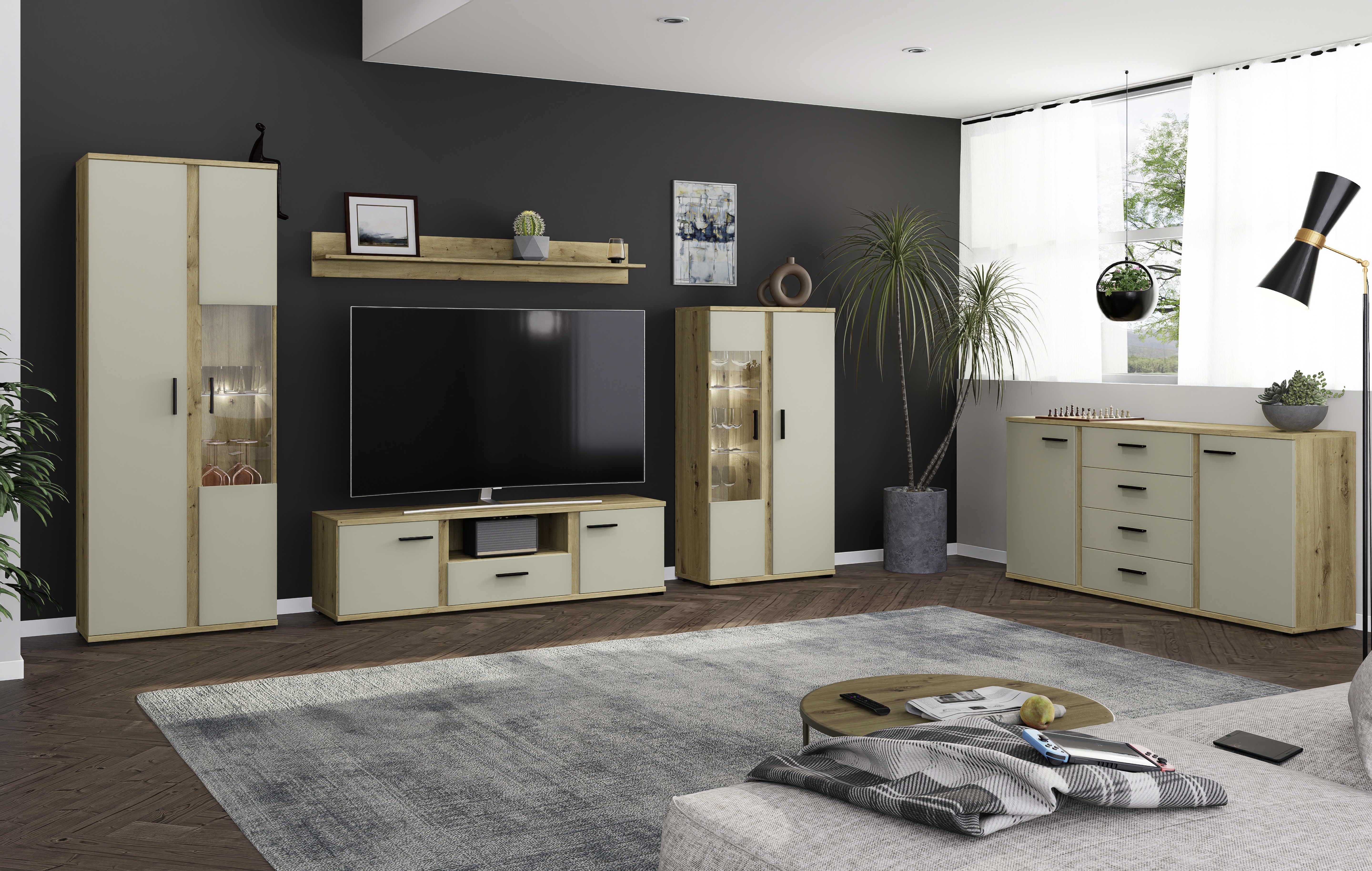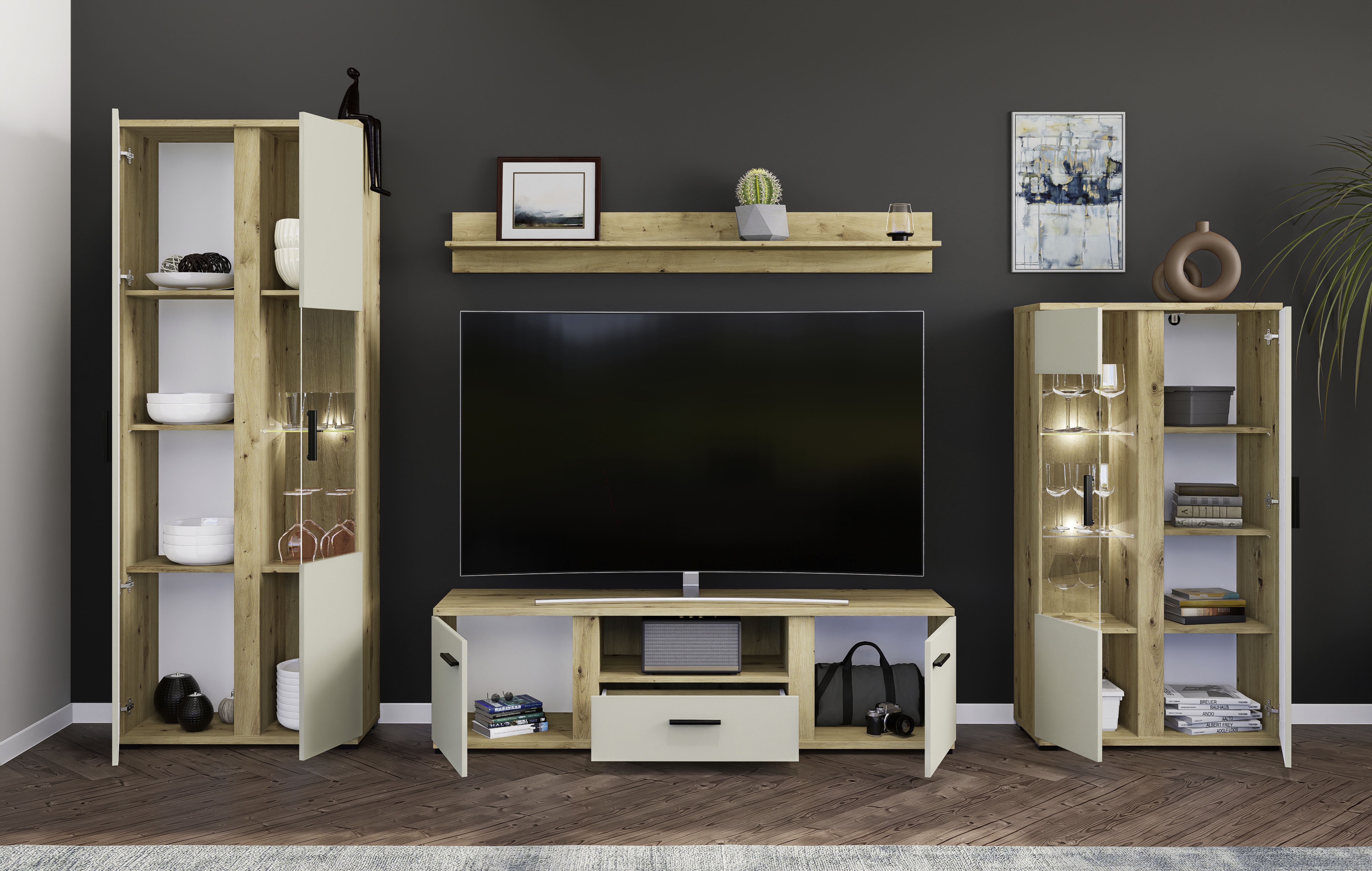 1 Lowboard mit 2 Türen, 1 Schubkasten mit Unterflurauszug, 1 offenem Fach und 1 Kabeldurchführung