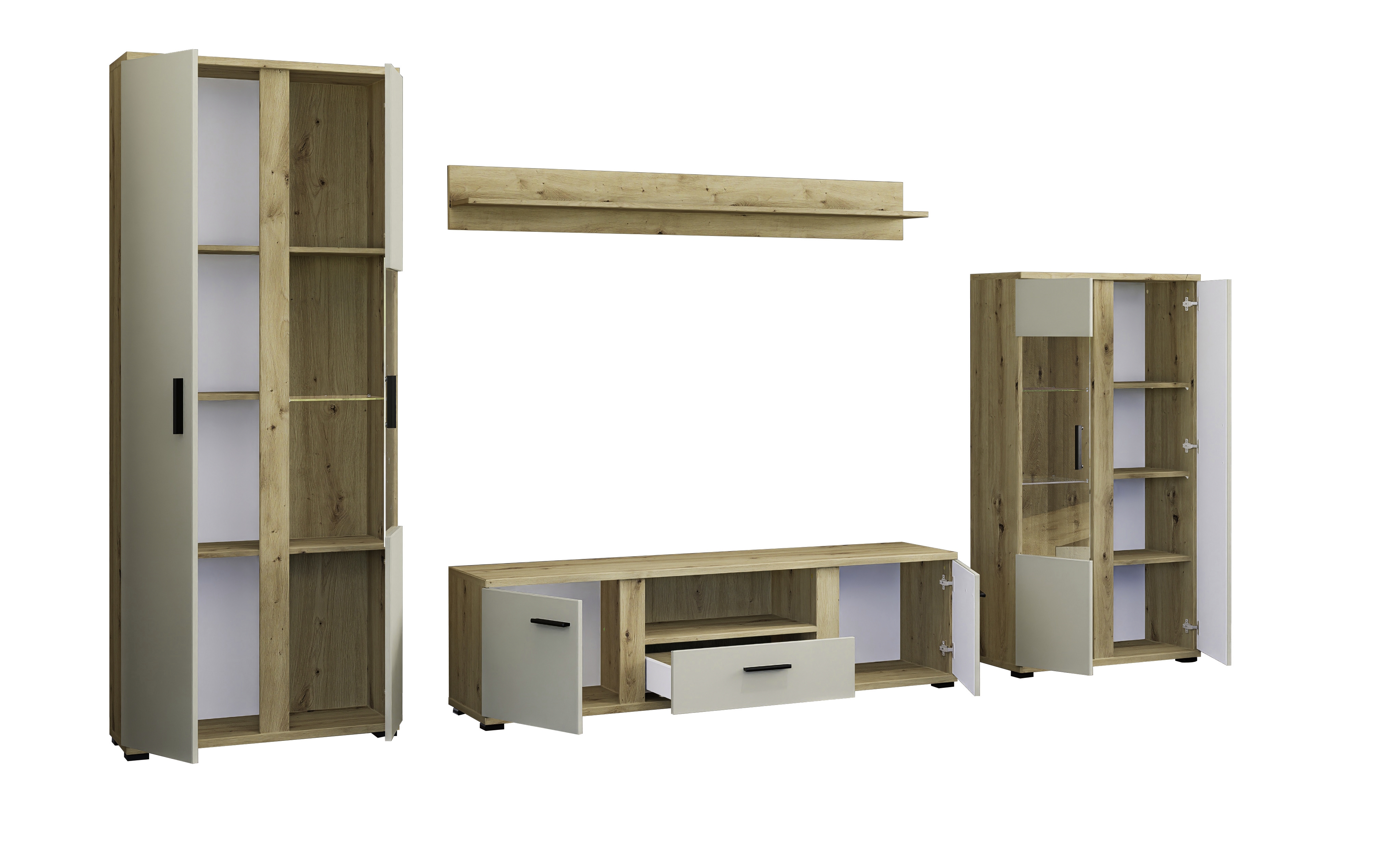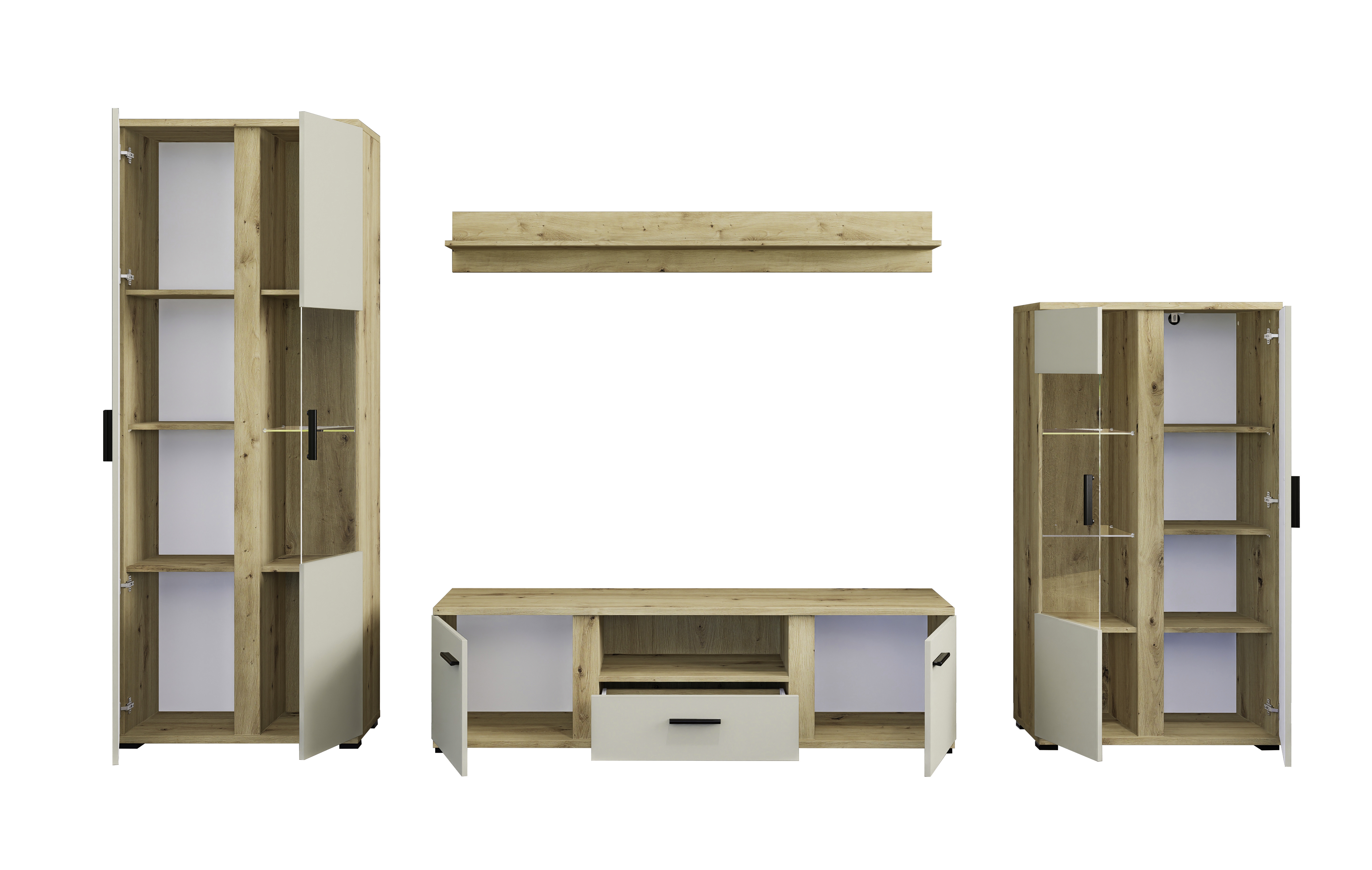 1 Stauraumelement mit 1 Tür, 1 Tür mit Teilverglasung, 2 Einlegeböden, 2 Glasböden und 2 Konstruktionsböden