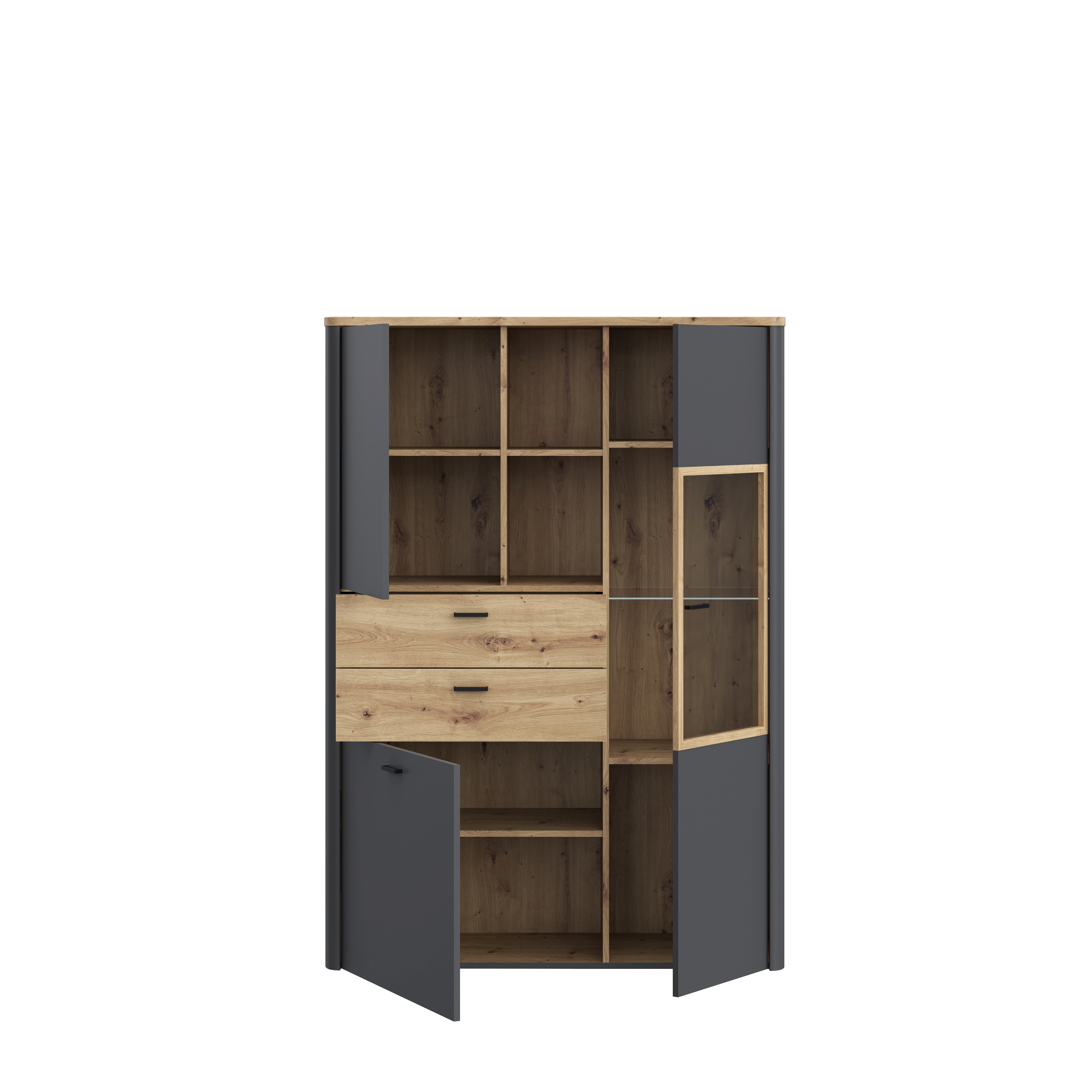 1 Vitrine mit 3 Türen (davon 1 Tür mit Glas), 2 Schubkästen, 2 offene Fächer