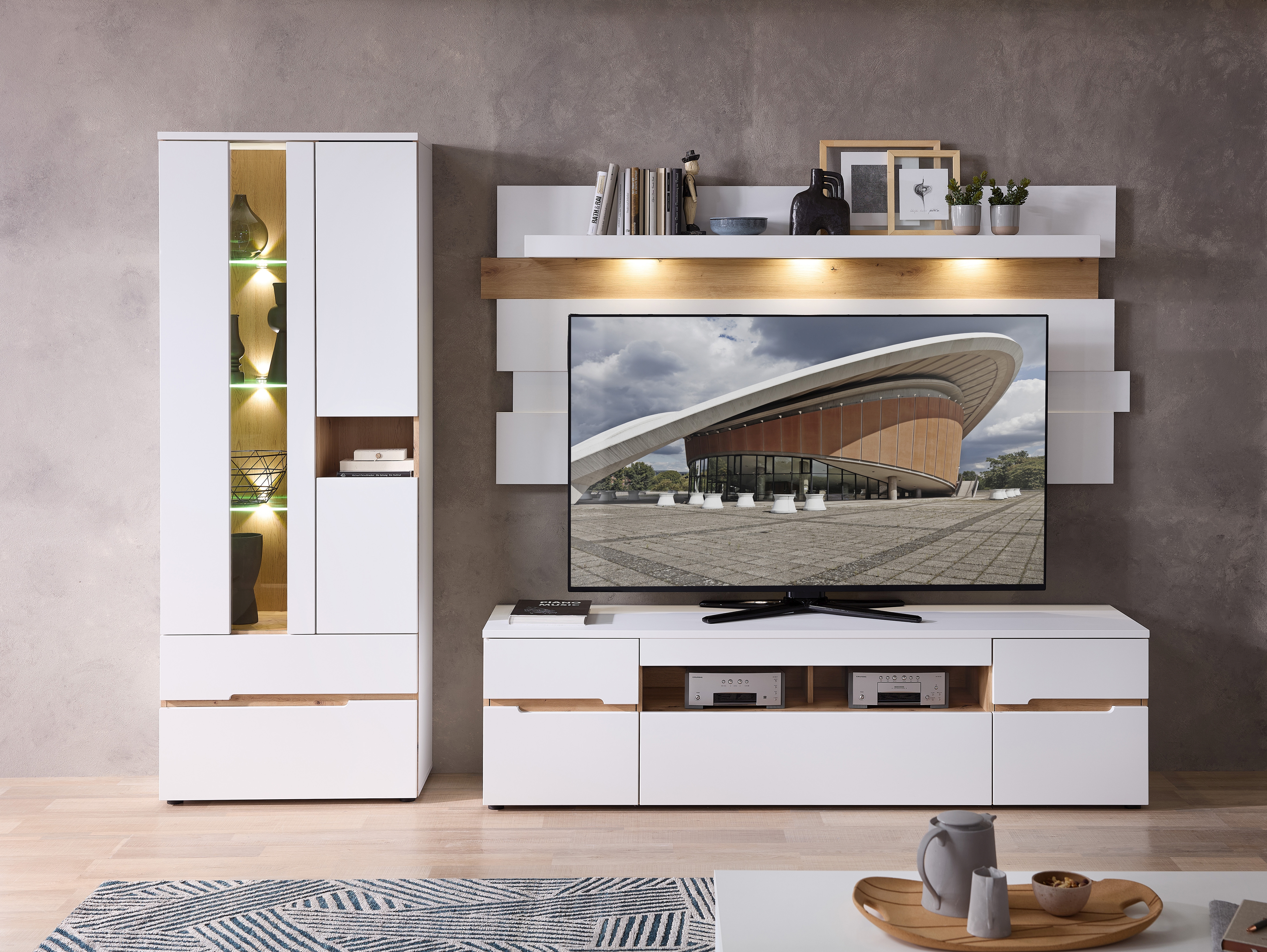 | Ausstattung Anbauwände: | inkl. Beleuchtung, offene Fächer | ||