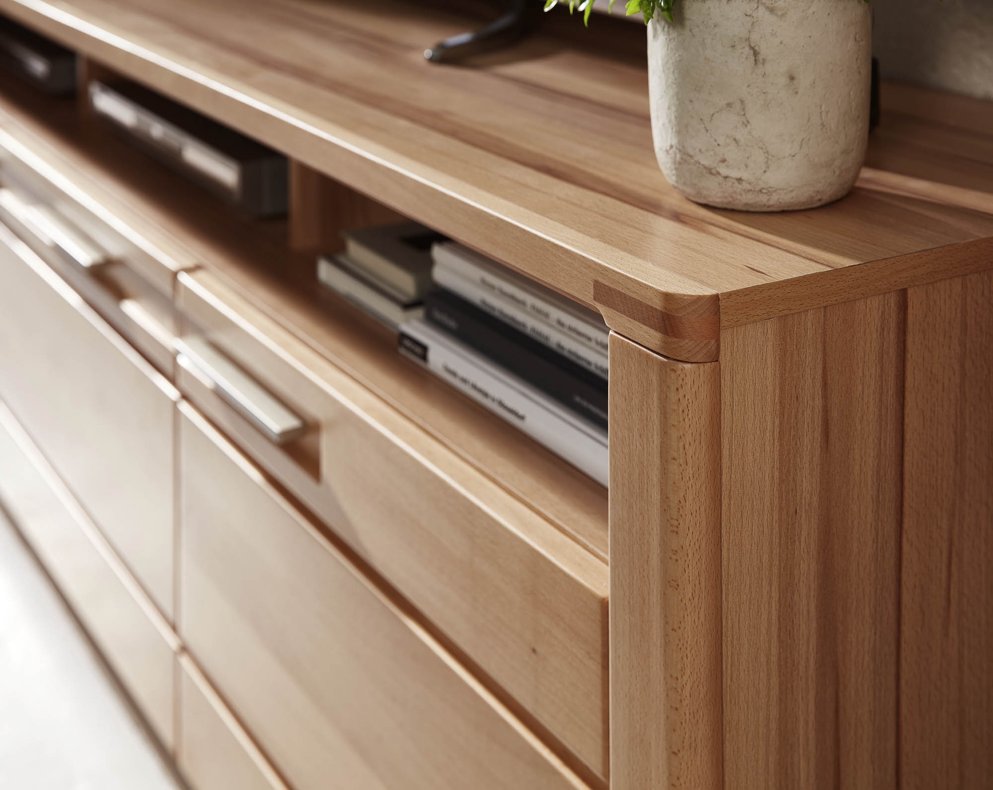 1 Lowboard mit 3 offenen Fächern, 3 Kabeldurchlässen und 3 Türen