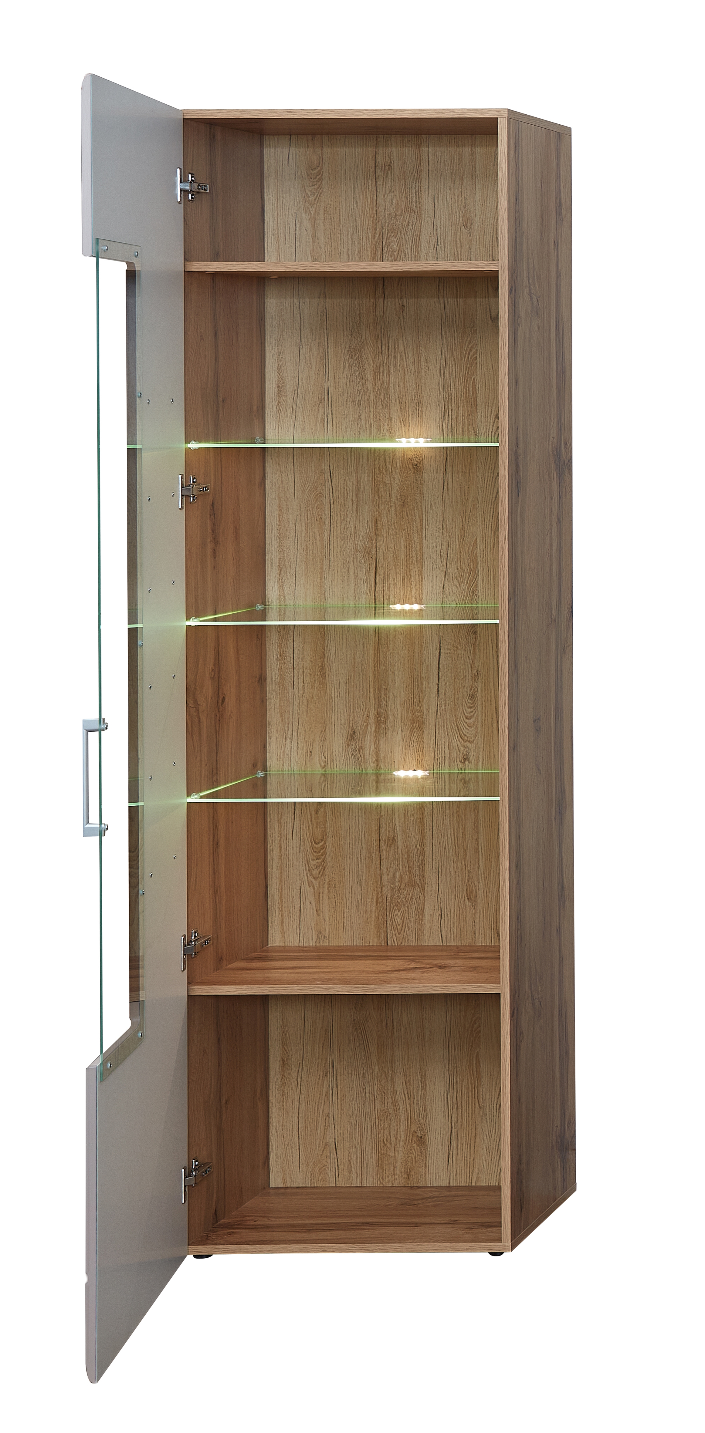 1 kleine Vitrine mit 1 Glas-/Holztür, 1 Holztür, 1 Glasboden und 5 Holzböden