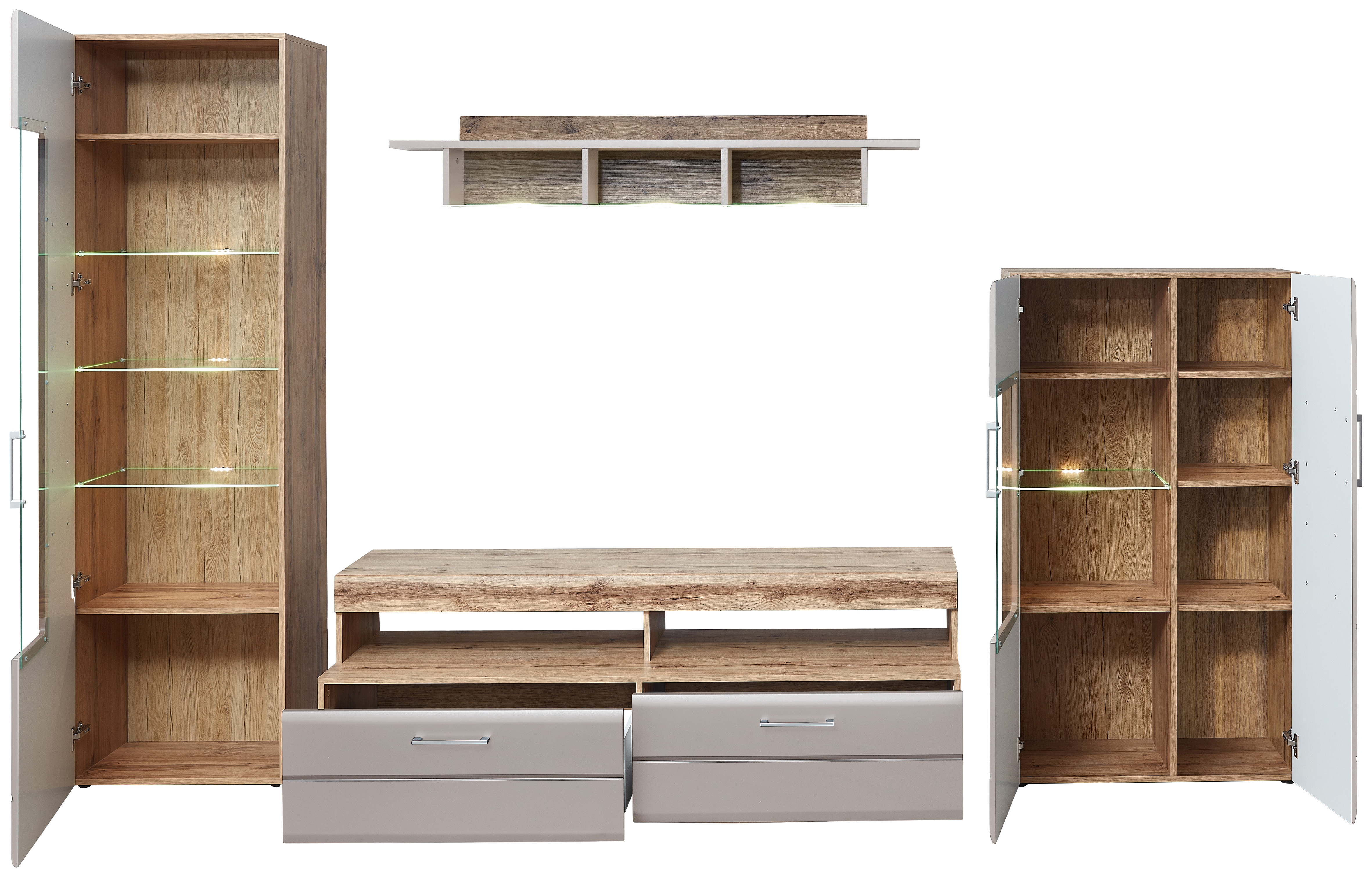 | Ausstattung Anbauwände: | Schublade(n), inkl. Beleuchtung, offene Fächer | ||