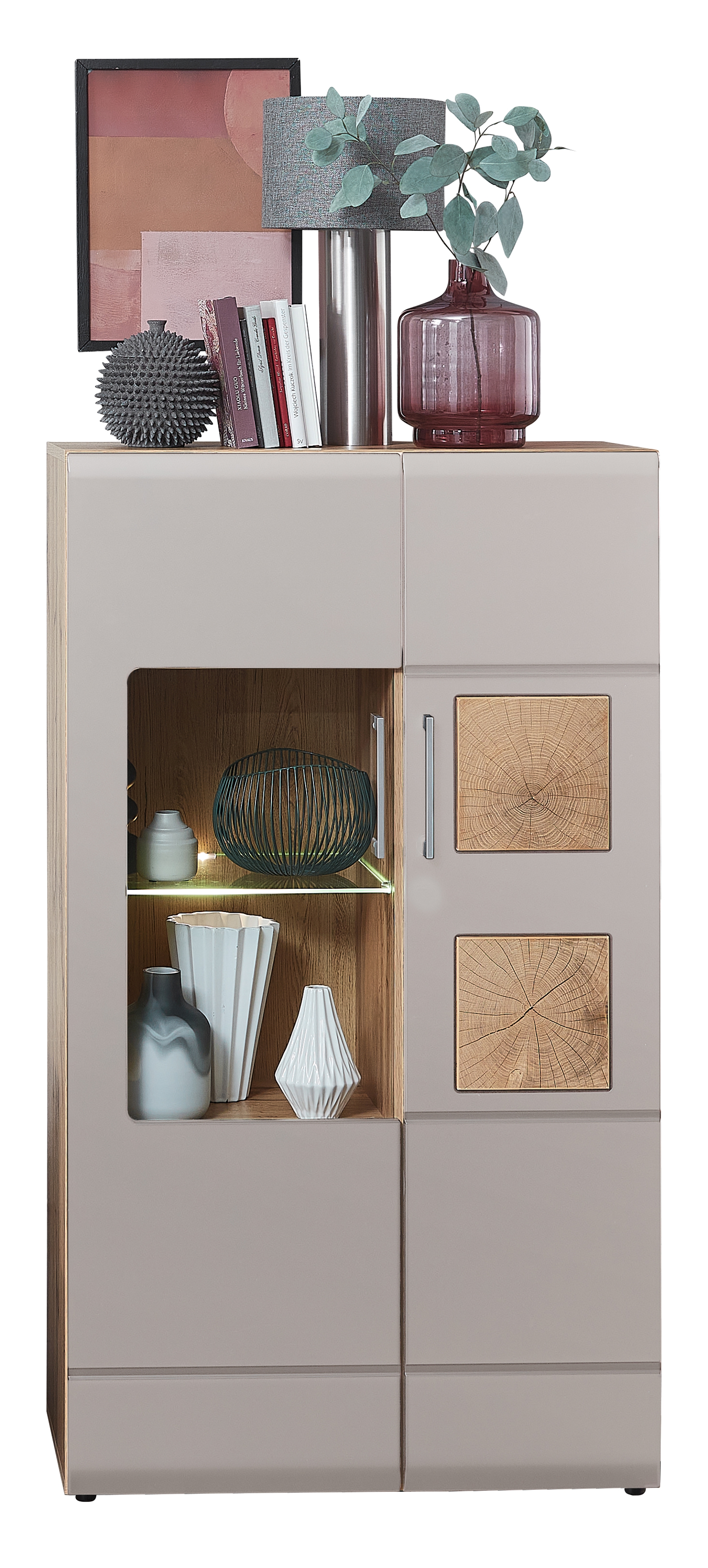 Front: Kaschmir matt MDF (Mitteldichte Holzfaserplatte) mit Absetzungen in Hirnholz Holznachbildung / Klarglas