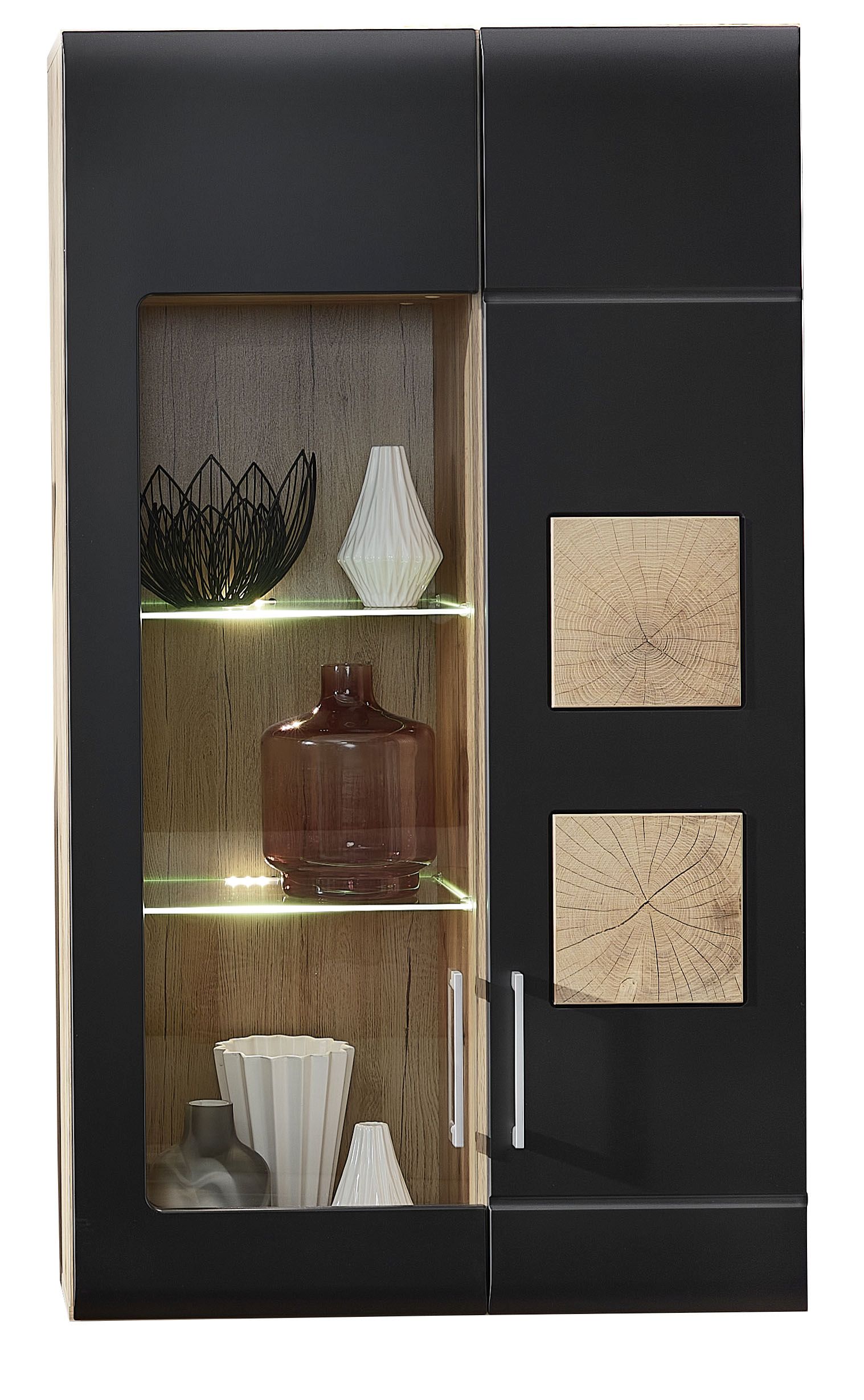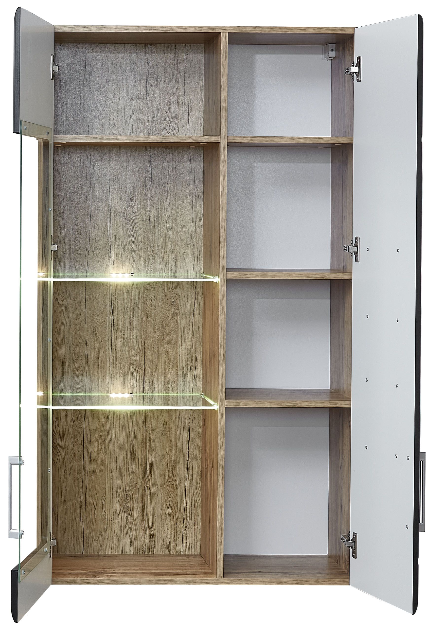 1 Hängevitrine mit 1 Glas-/Holztür, 2 Glasböden, 1 Holztür, 4 Holzböden, inklusiver LED-Beleuchtung