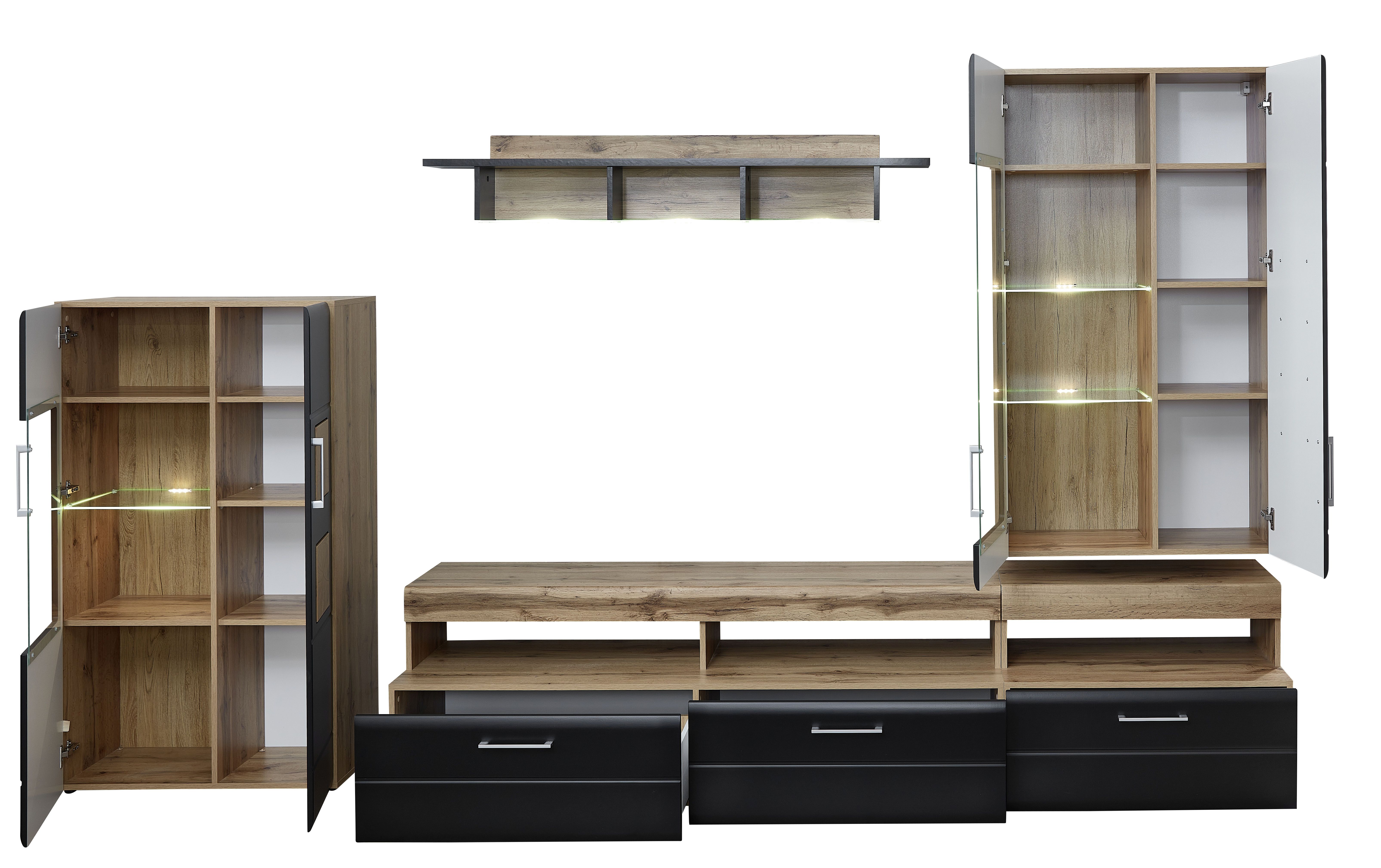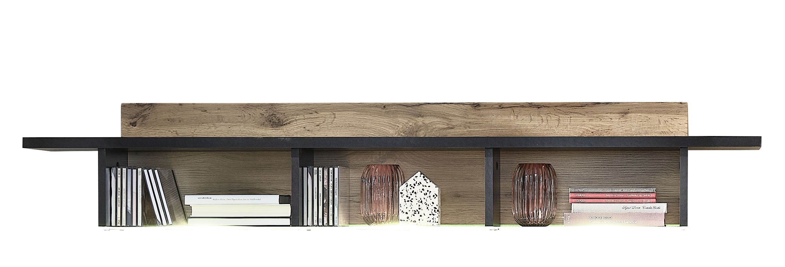 1 Wandboard mit 1 Holzboden, 1 Glasboden, 3 offenen Fächern, inklusive LED-Beleuchtung