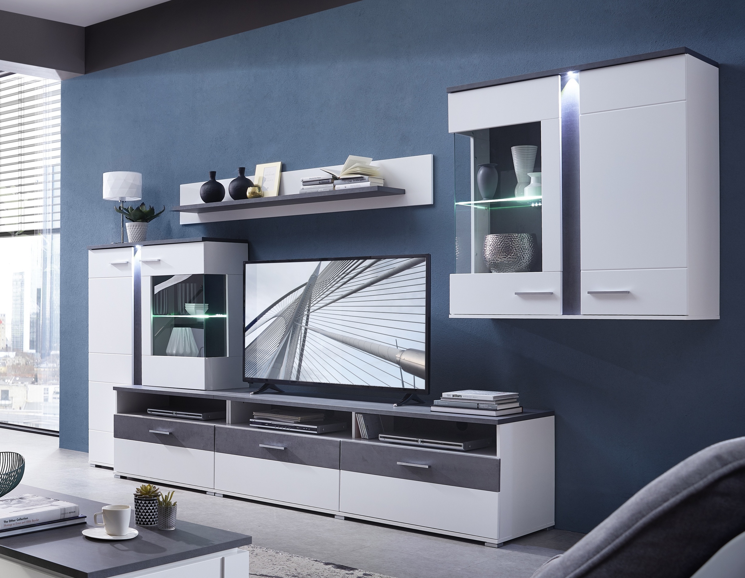 | Ausstattung Anbauwände: | Schublade(n), inkl. Beleuchtung, offene Fächer | ||
