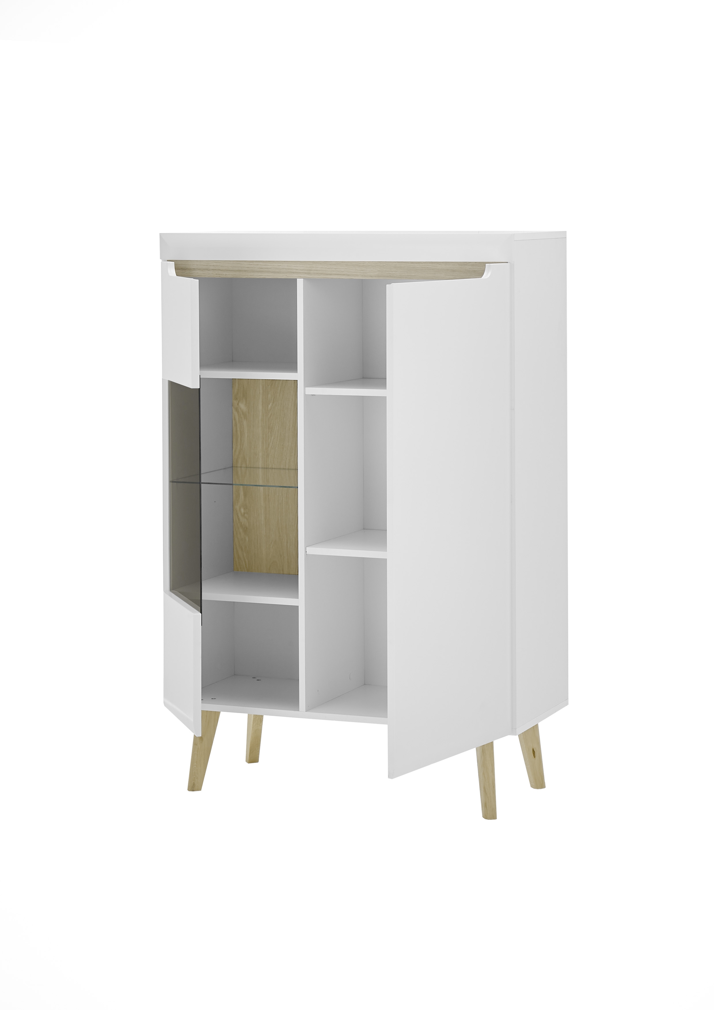 1 Highboardvitrine mit 1 Tür mit Glasausschnitt, 1 Tür, 1 Glasboden und 4 Böden