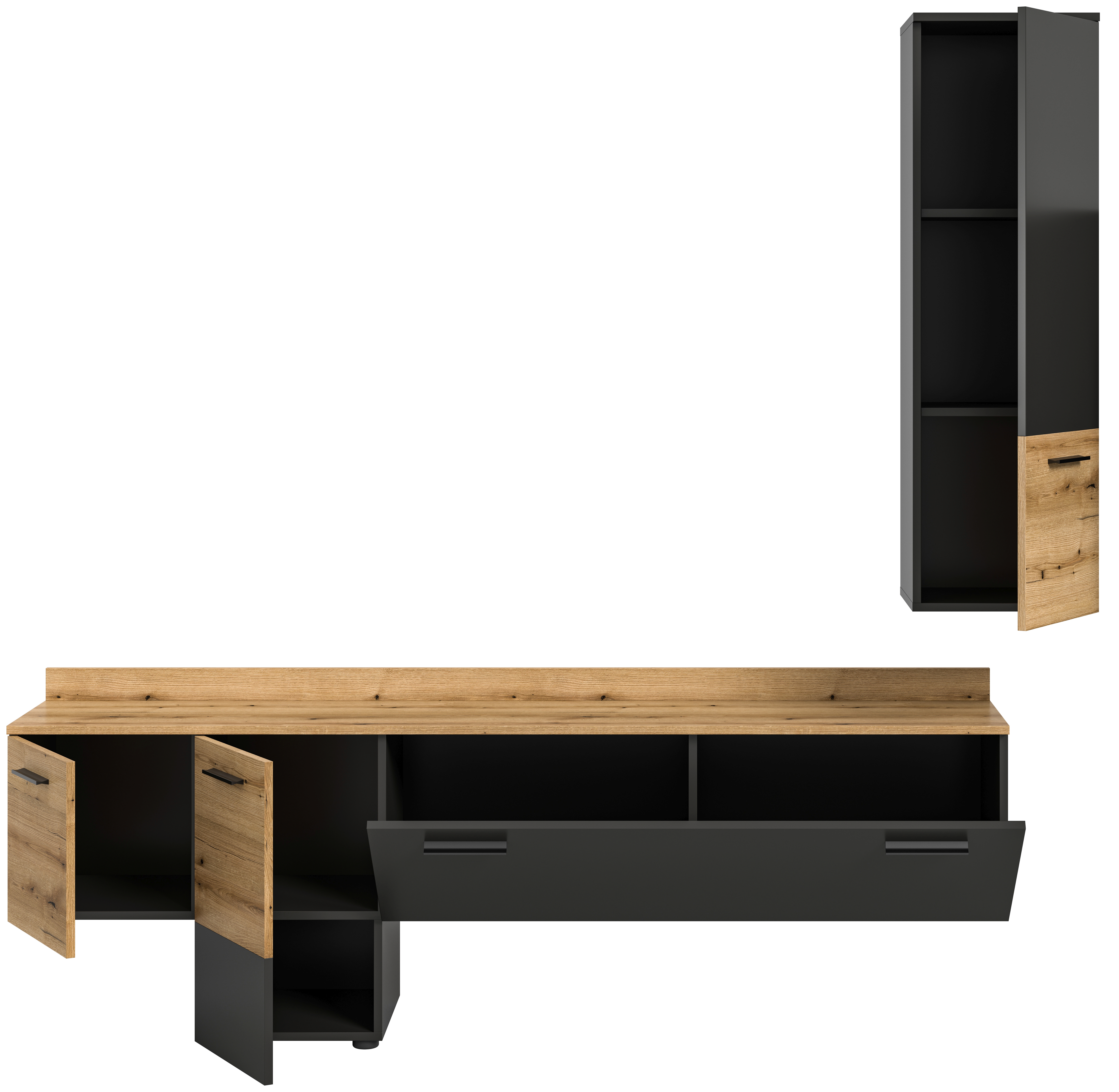 - Einsatzbereich: Geeignet für verschiedene Wohnbereiche wie Wohnzimmer, Appartements, Studios oder Jugendzimmer, bietet die Wohnwand eine funktionale und ästhetisch ansprechende Lösung zur Gestaltung und Nutzung des Raums.