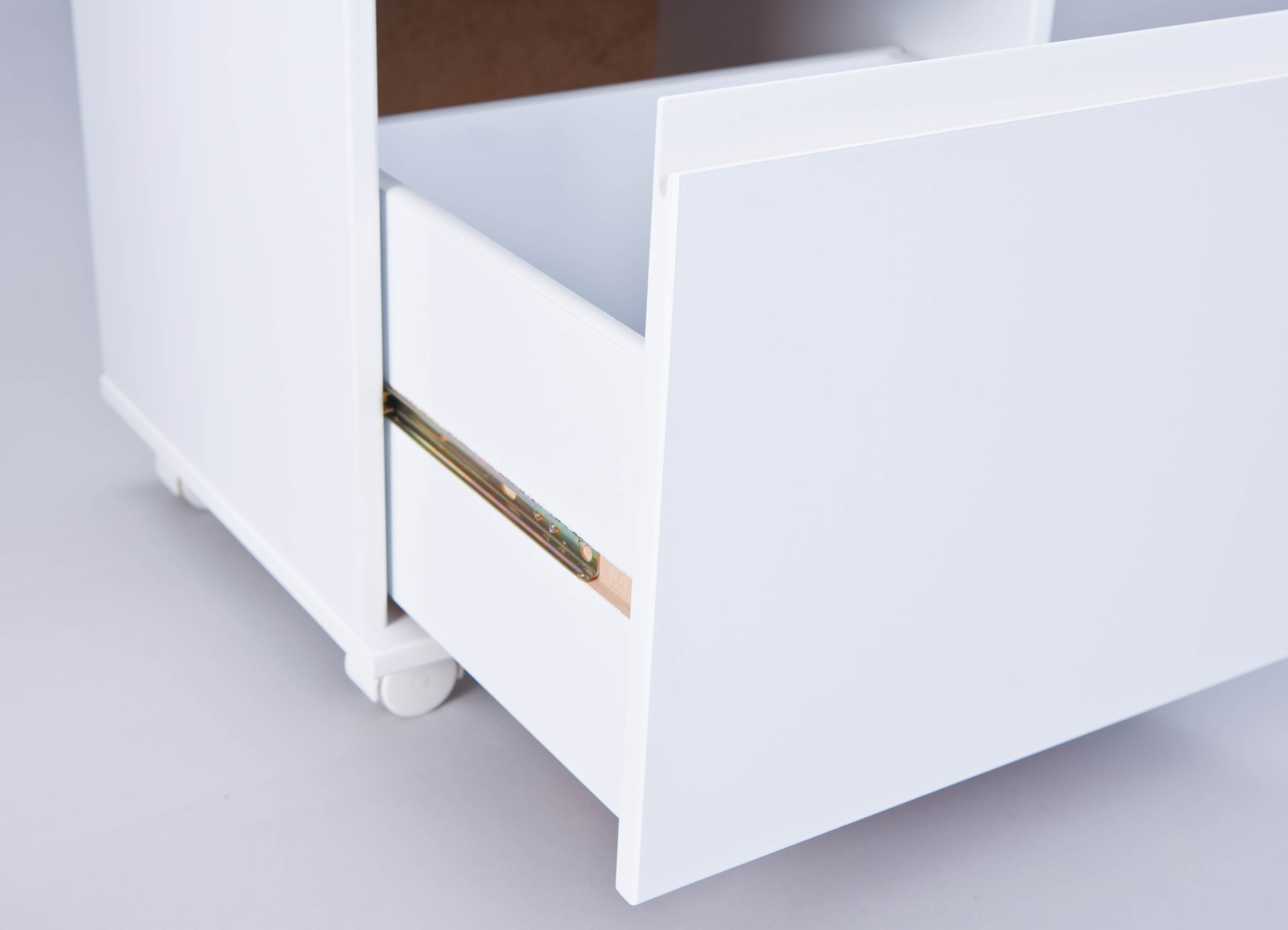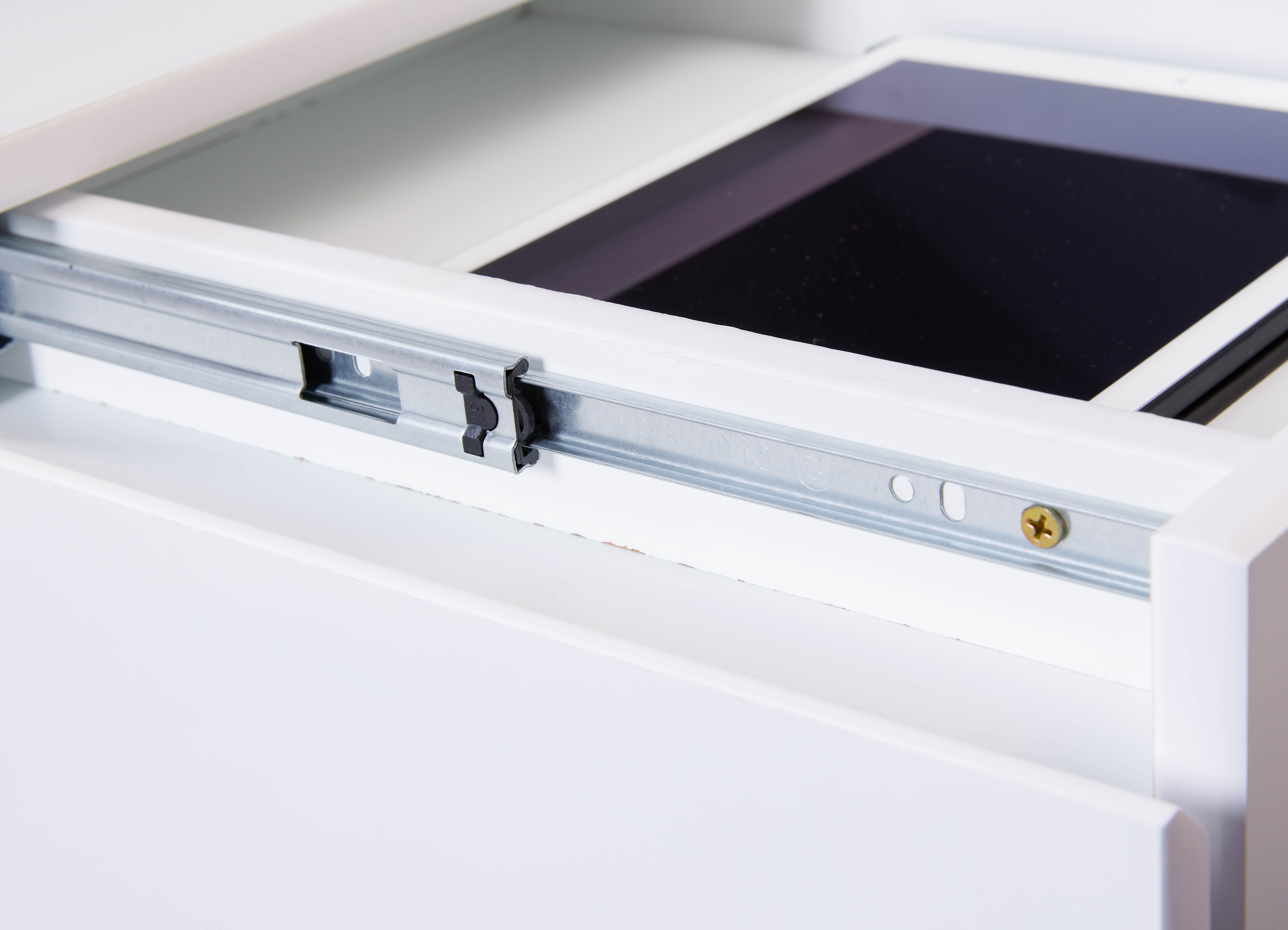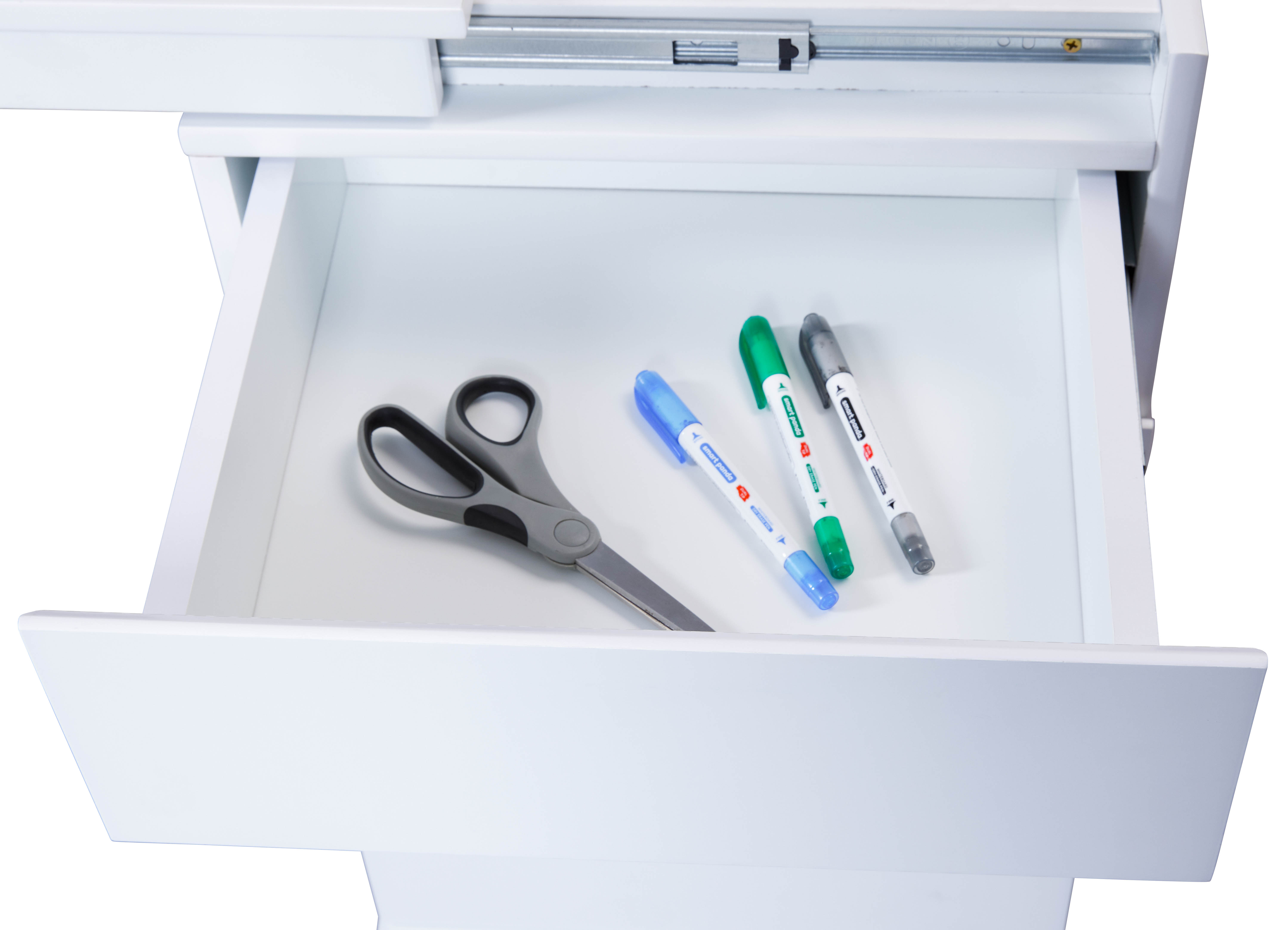 Auf der rechten Seite befinden sich drei Schubladen, die auf Metallschienen montiert sind, um Ihnen mehr Benutzerkomfort zu bieten.