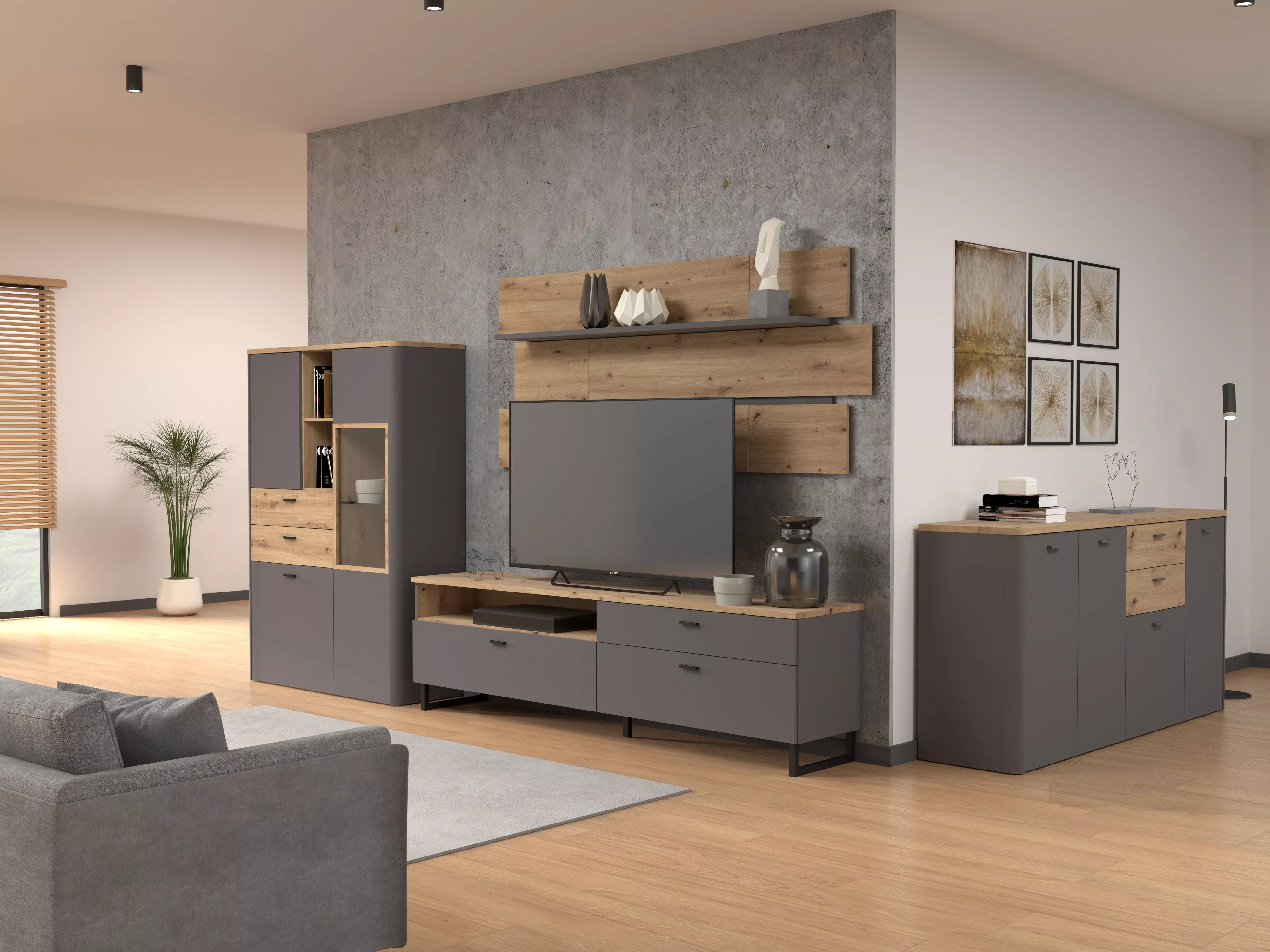 Wohnwände mit Sideboard Vitrine, LED Beleuchtung und TV Paneel